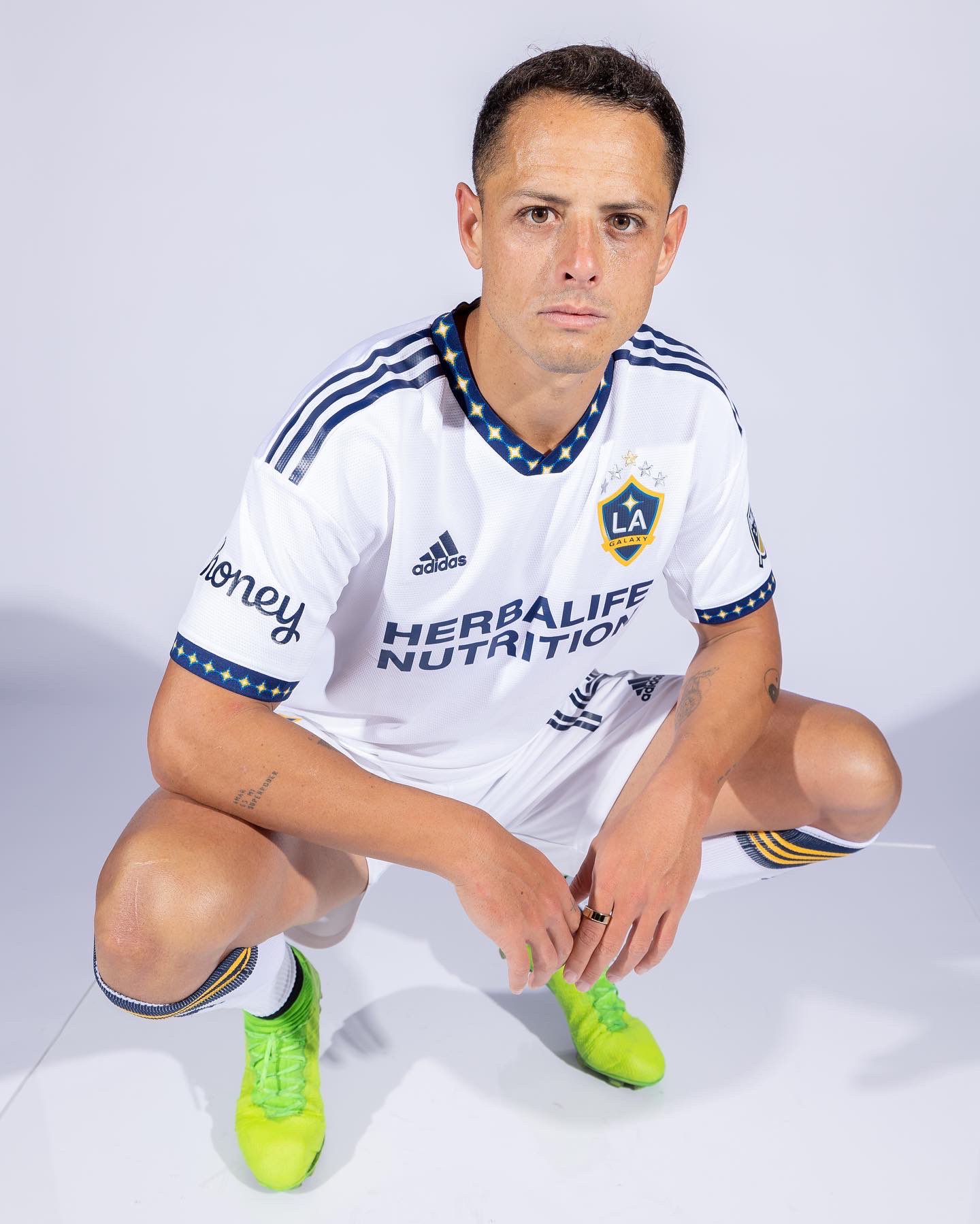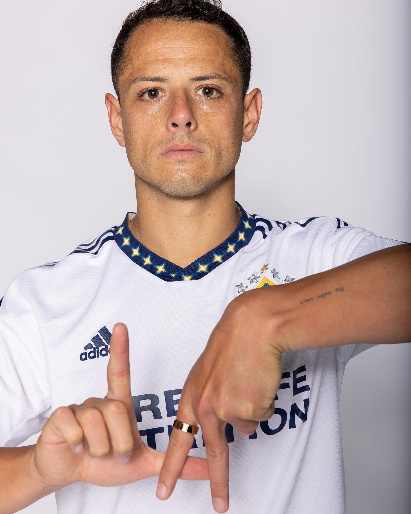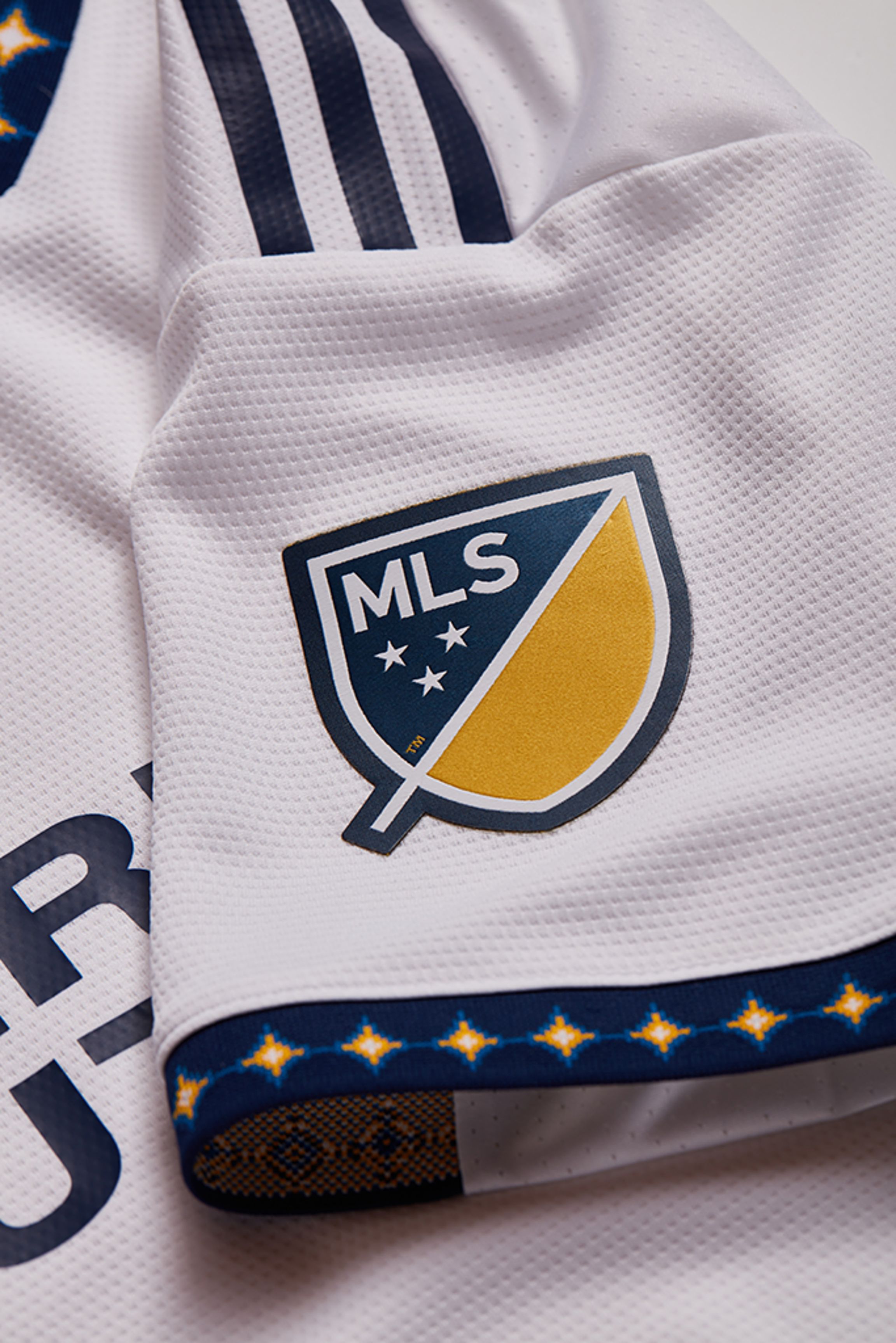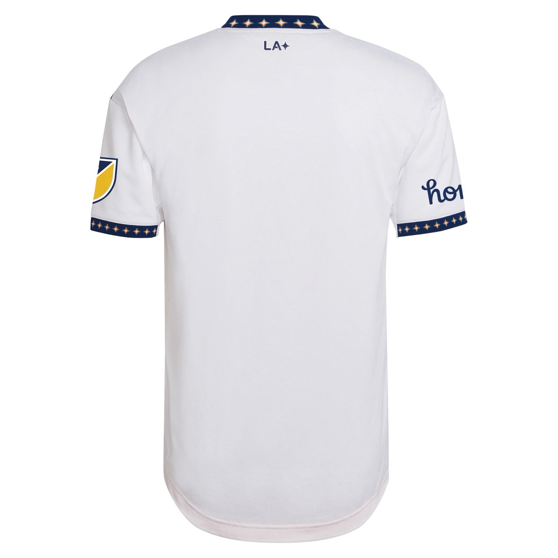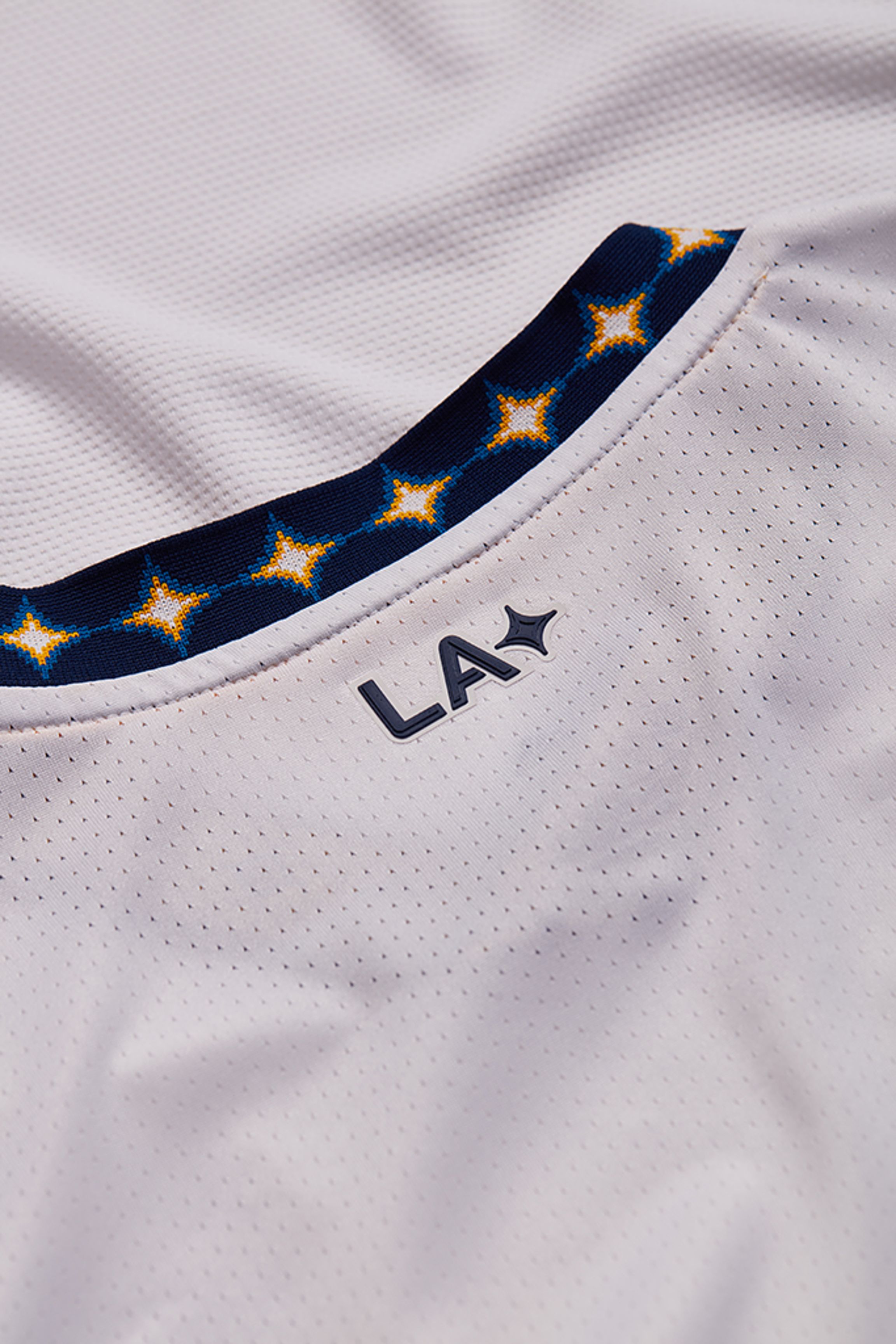 On the back neck of the jersey lies the LA wordmark with the quasar. Club and city come together in a mark that ties the initials “LA,” used globally to refer to the City of Angels, to the quasar, which is the heart of a galaxy and generates tremendous light and energy. Additionally, the neck and sleeve on the jersey showcase interlocking quasars.