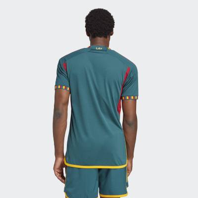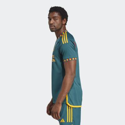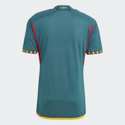 The Away kit features green, gold, and red colours that represent olive trees, orange groves, and vineyards. Additionally, the Los Angeles flag pattern can be found on the jersey trim on the neck and sleeves.