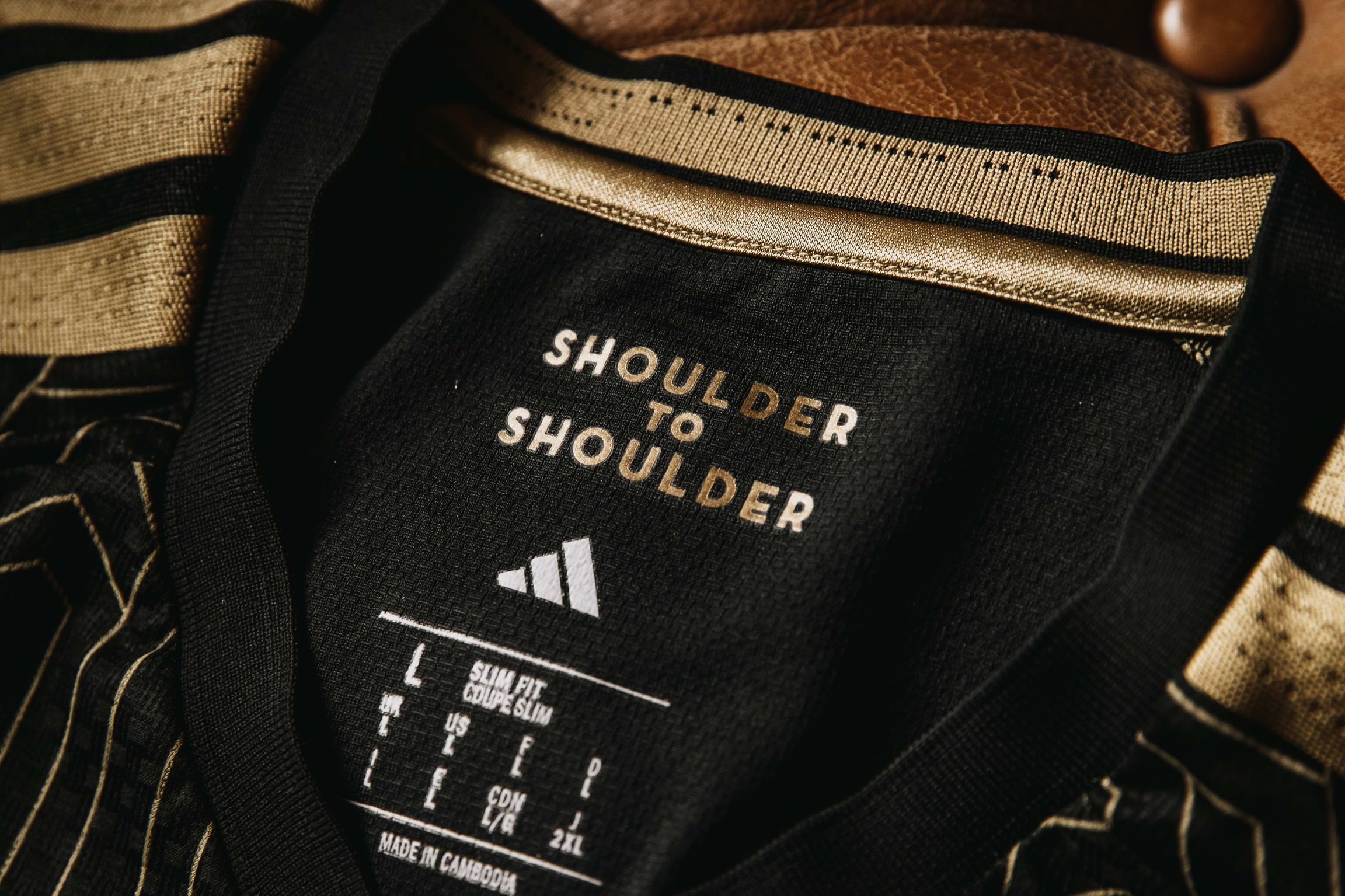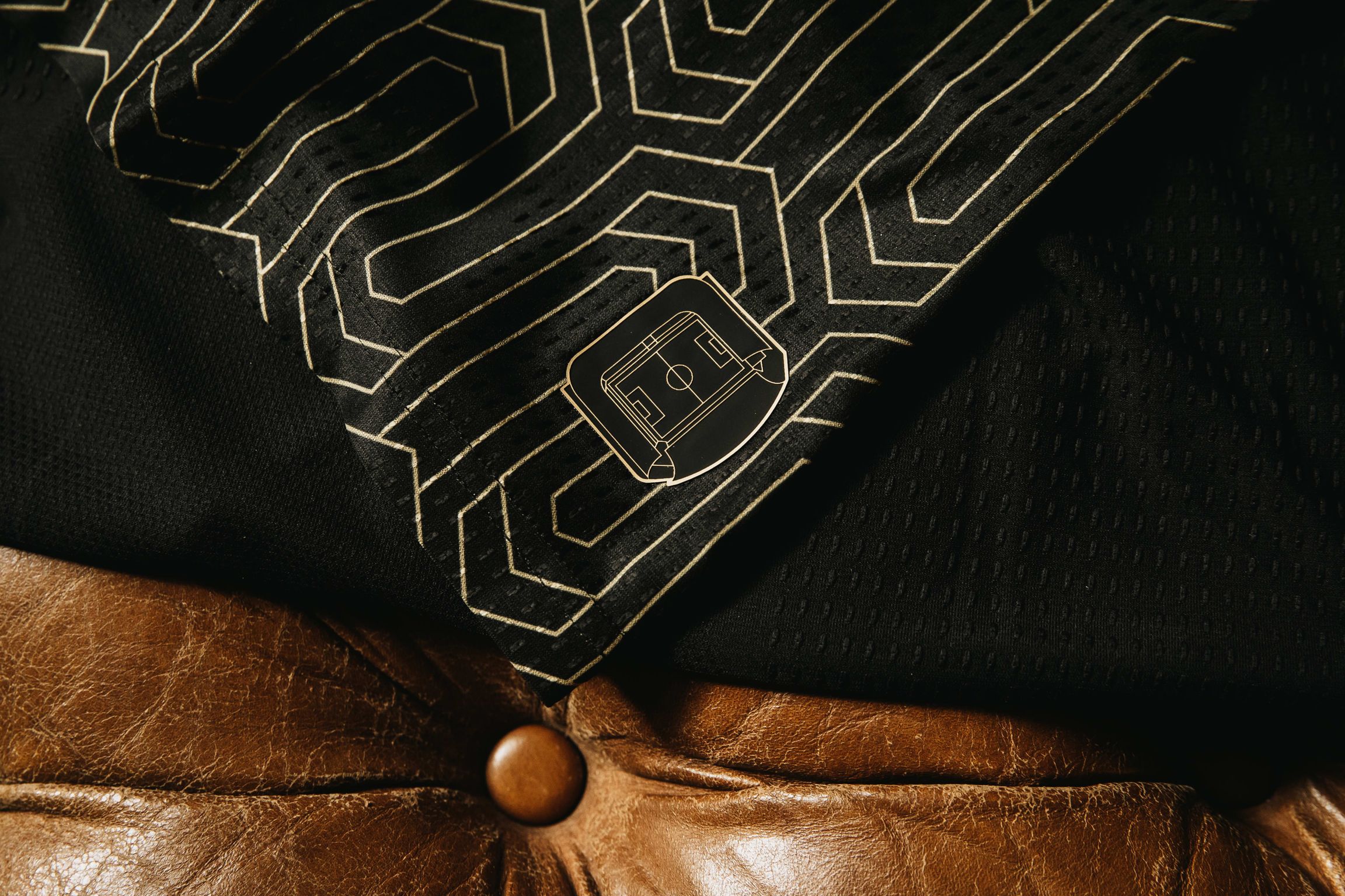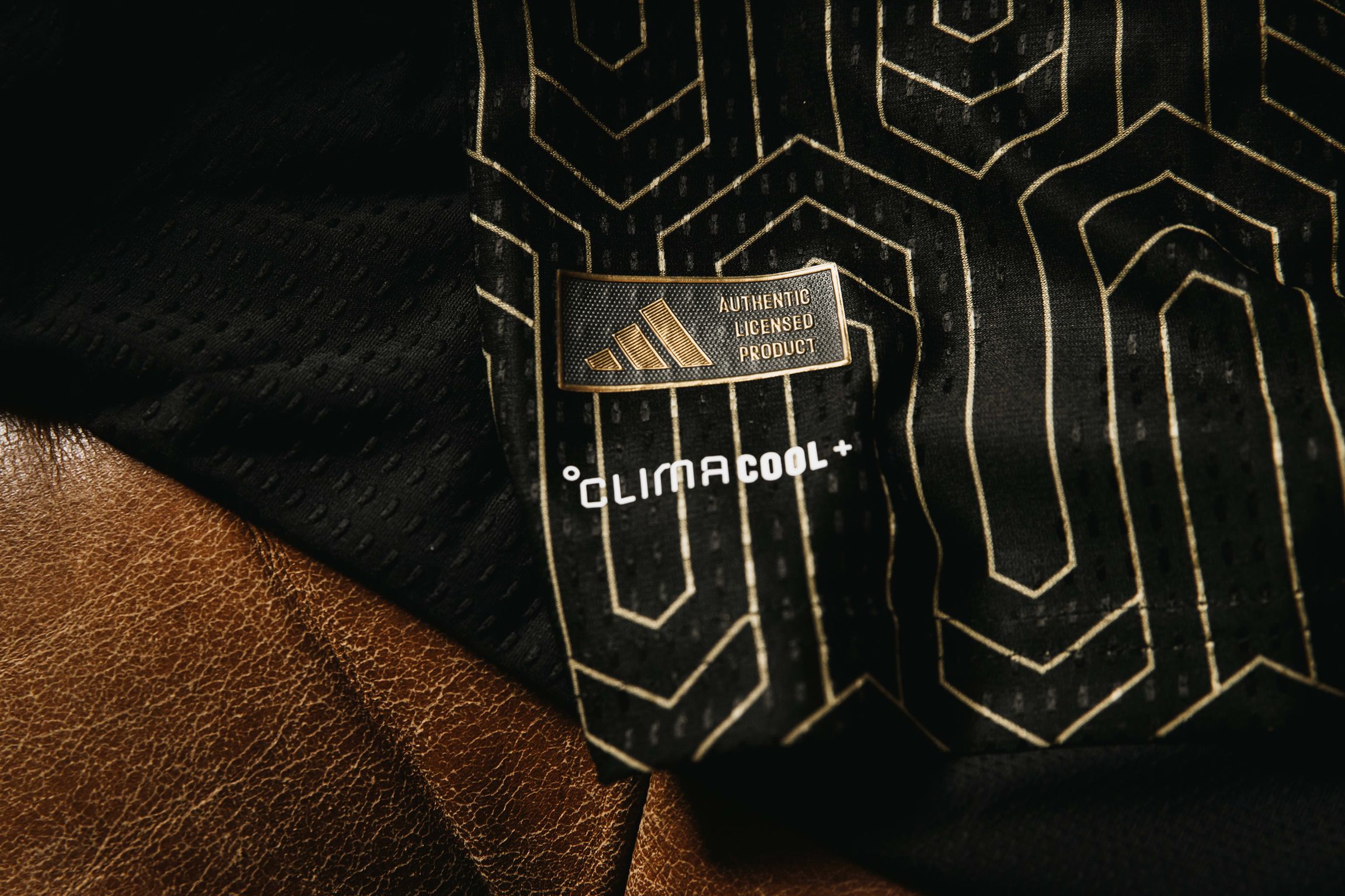 The new LAFC jersey retains the club’s established black and gold colour scheme, presented with an all over geometric graphic inspired by Art Deco architecture associated with Los Angeles. The pattern runs across the front and sleeves, formed from repeating linear motifs in metallic gold on a black base. The rear panel is predominantly black with subtle texture detailing for contrast.