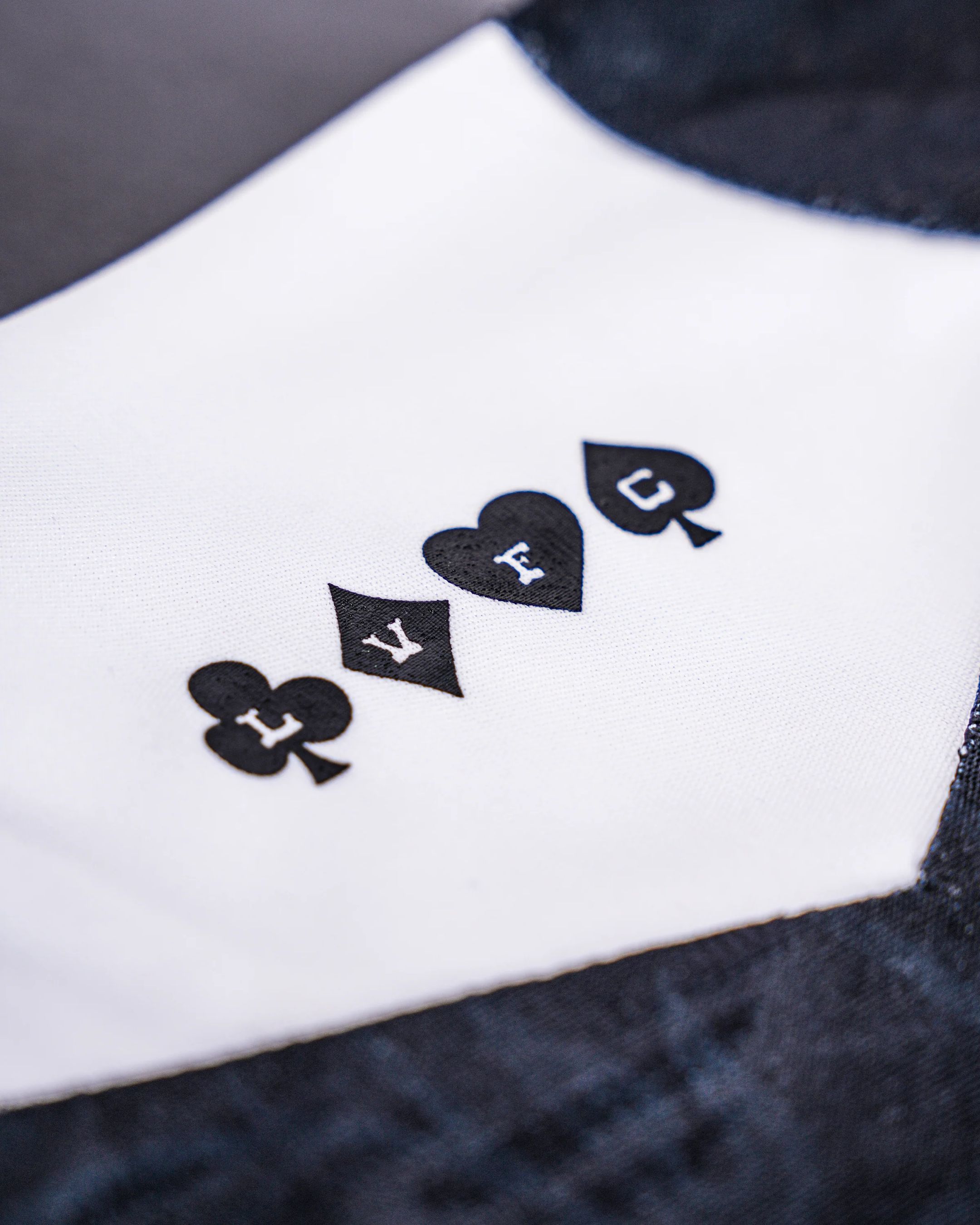 The new Las Vegas Lights jersey is presented in black, with a tonal jacquard graphic integrated throughout the fabric. The pattern references the decorative backs of playing cards commonly associated with Las Vegas casinos, creating a layered texture effect across the front, sleeves and back panel. A white insert sits at the upper back beneath the collar, adding contrast to the darker base.