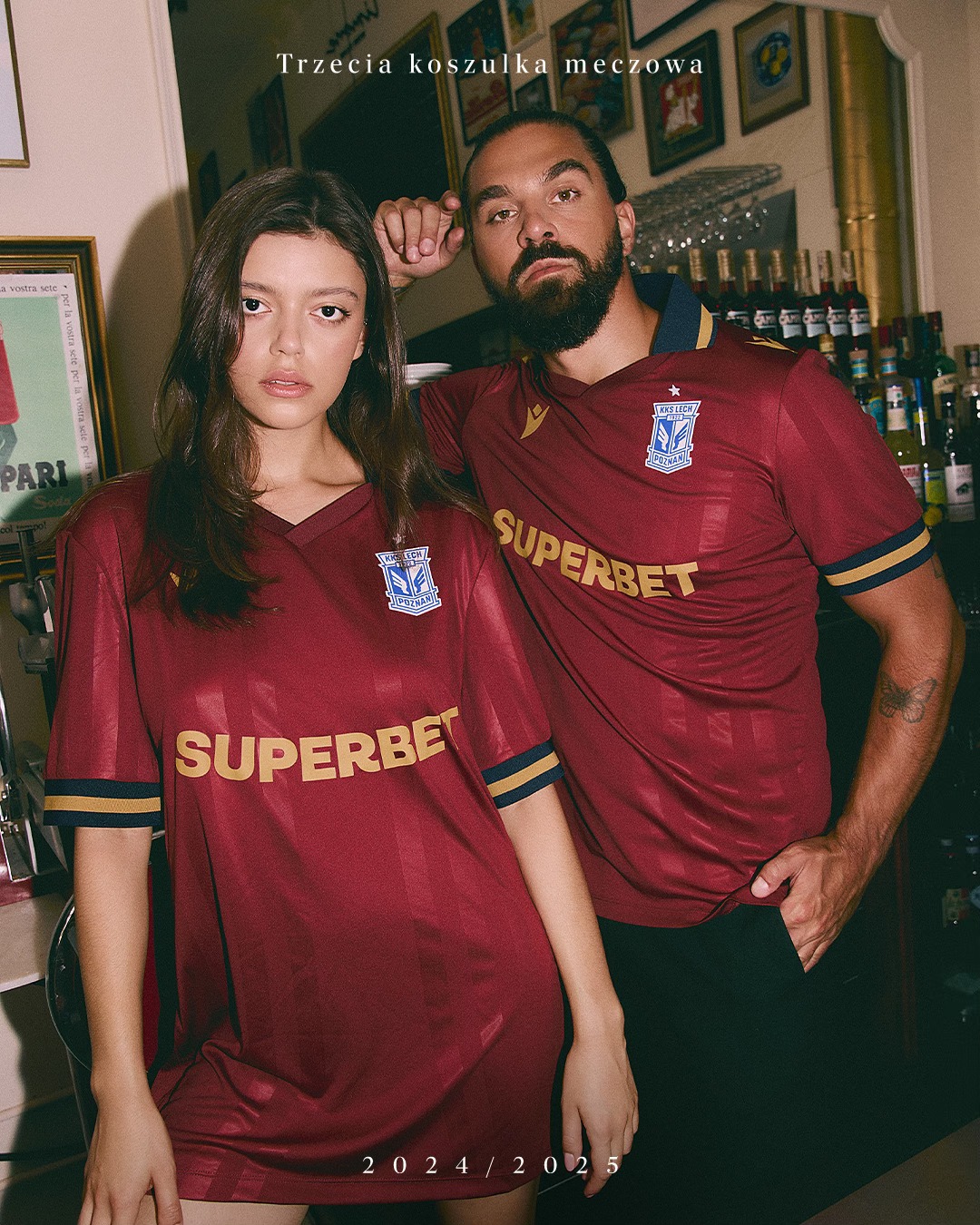 In burgundy to refer to early colours - dictated by the fabric available when kits were first provided - the Polish Ekstraklasa side’s new secondary-change release from Macron also features subtle ghost striping suggesting iconic home-ground floodlights of the past and a debossed legend of “LECH POZNAŃ” nodding to the stylings from that era too.
