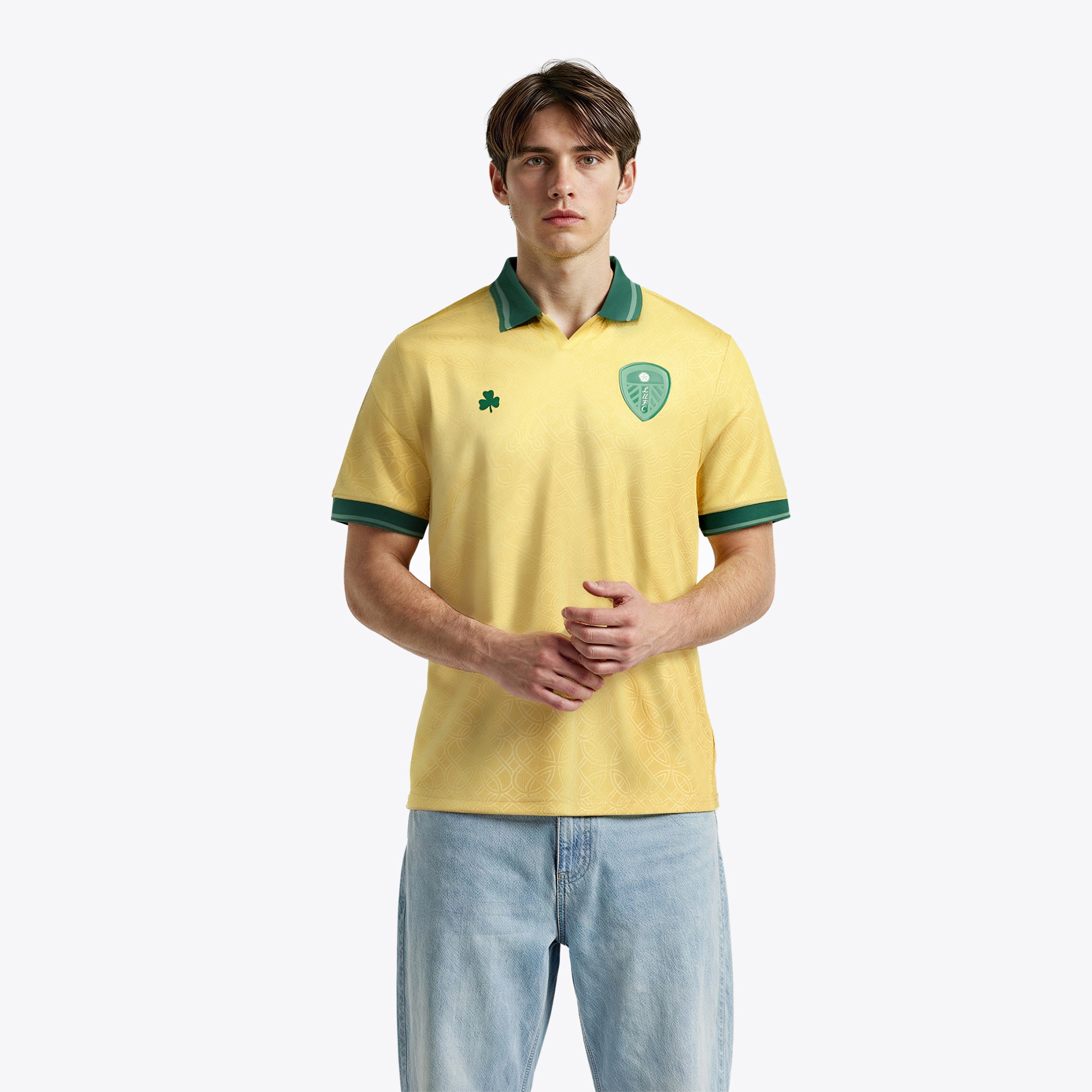 The Leeds shirt is presented in a gold base with an all over tonal Celtic inspired knotwork pattern, extending across the body, sleeves and back to create subtle surface detailing. A dark green fold-over collar is combined with matching green sleeve cuffs, both finished with clean edging.