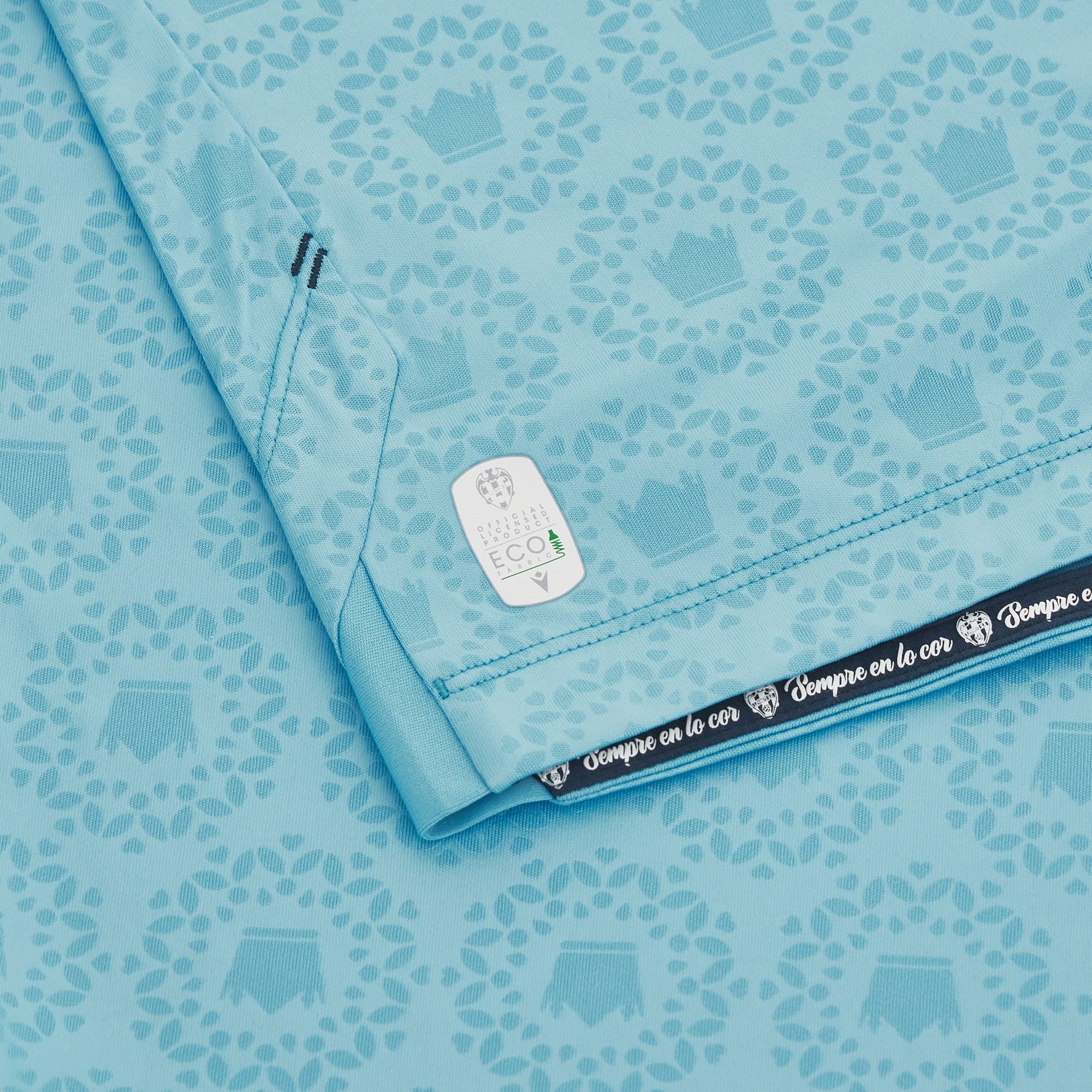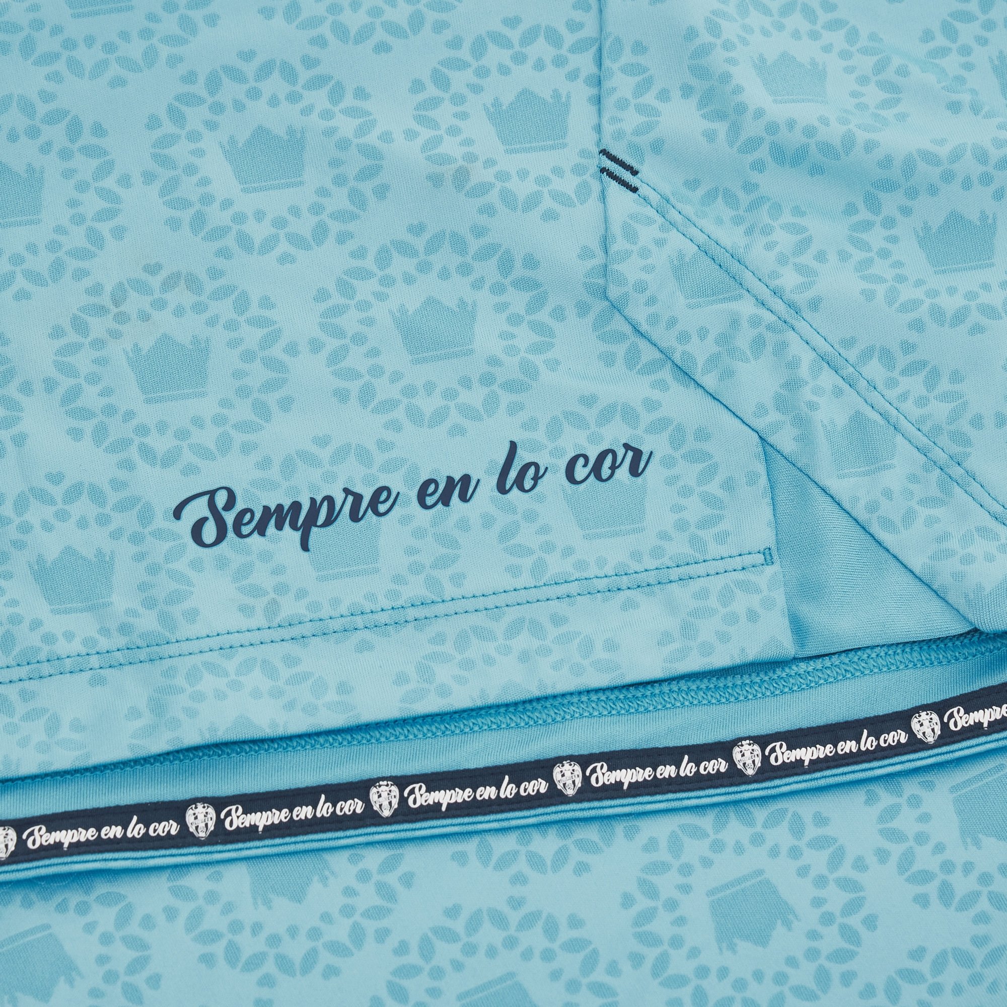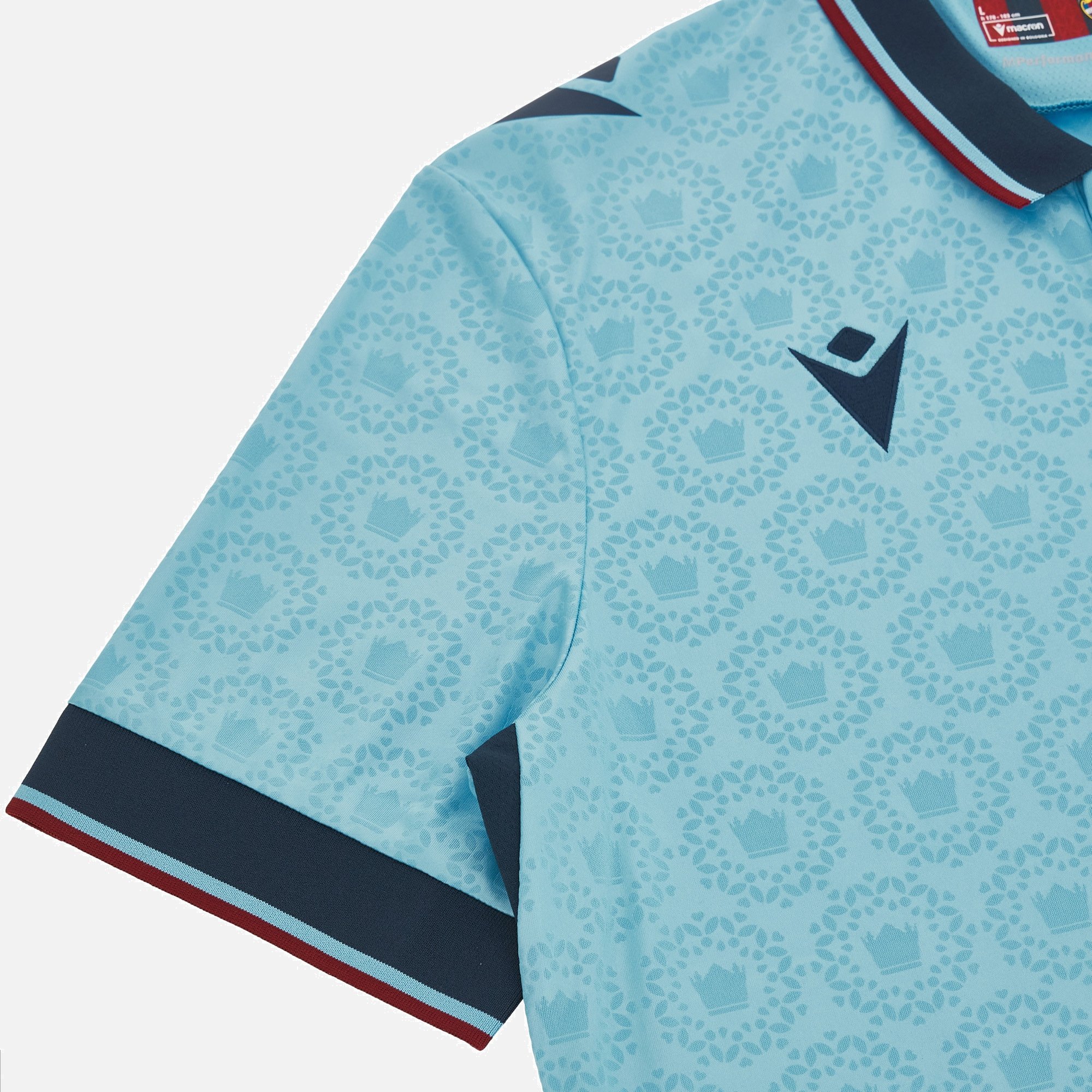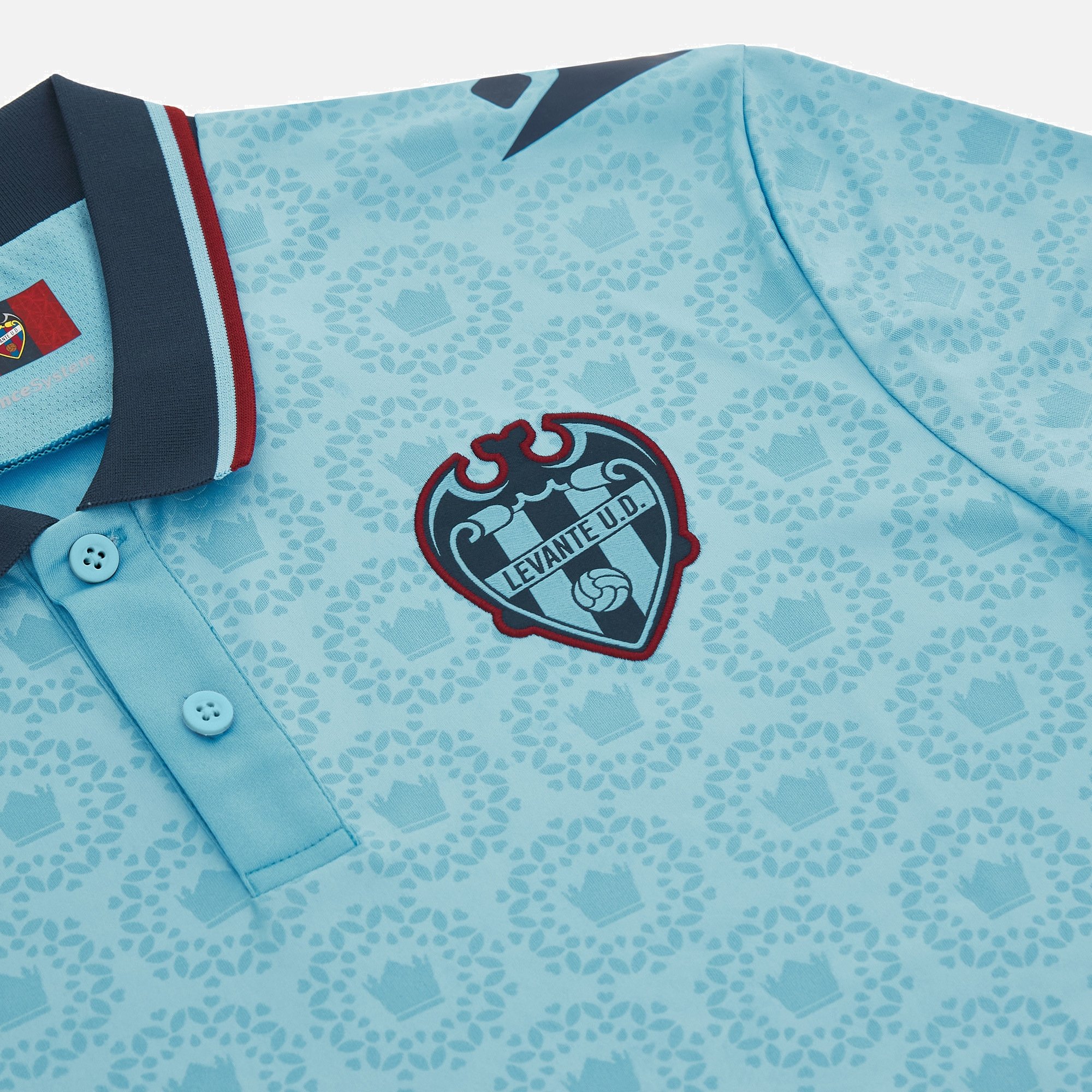 The Levante UD third kit by Macron is inspired by the centenary of the Canonic Coronation of the statue of the 'Virgen de los Desemparados' (Our Lady of the Forsaken). The shirt features clear references to the event, with a relief pattern composed of little crowns and light blue colour complemented by dark blue and garnet details.