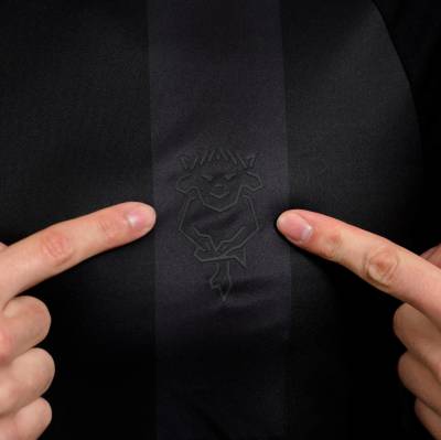 There is a subtle tonal stripe running behind the said crest, fleur-de-lis patterning running down the sides of the trunk and the underarms, and the kit is completed with matching black shorts and socks.