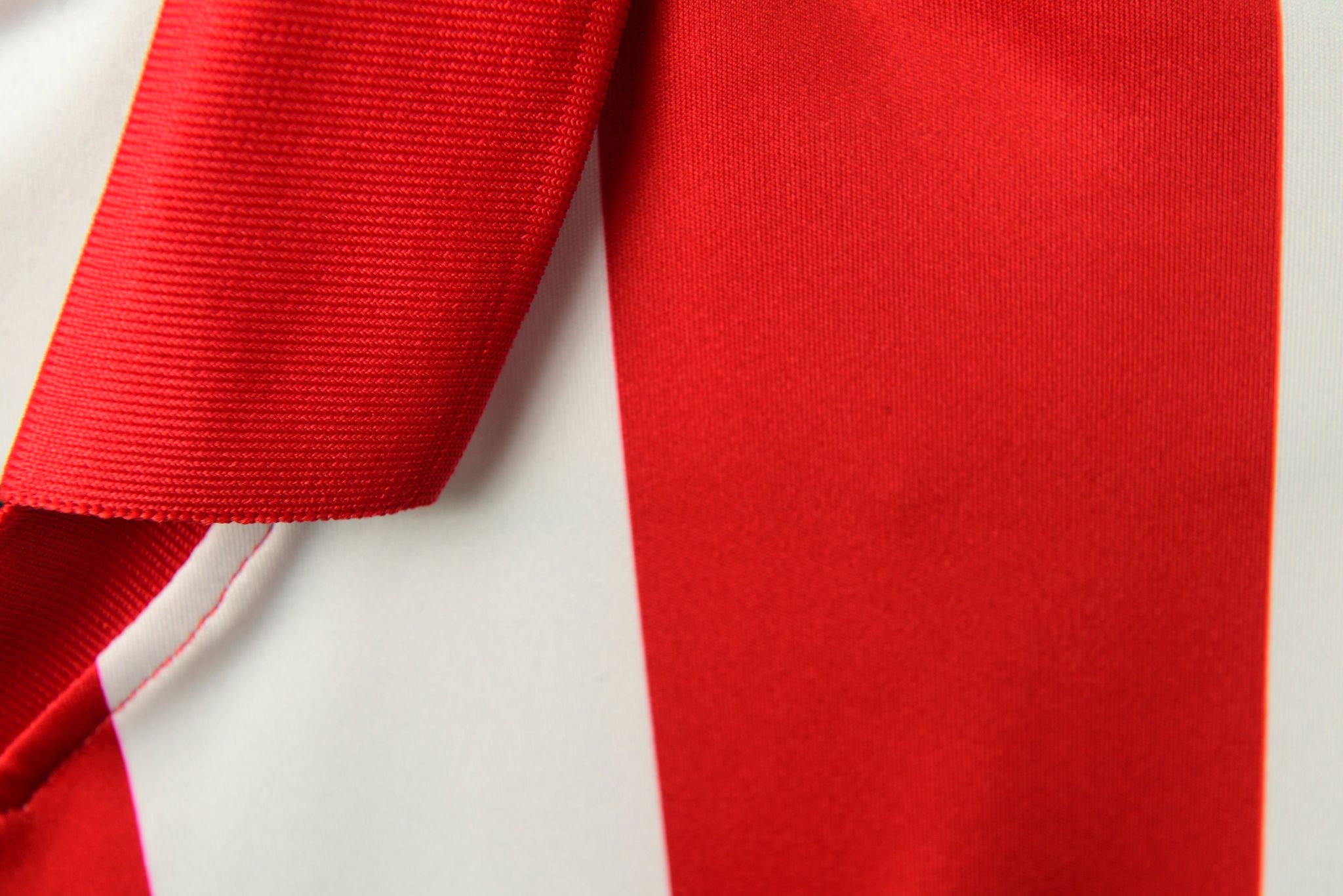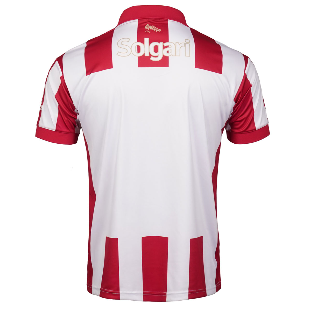 On the reverse, a predominantly white back panel is used with red block elements at the upper and lower sections. The kit is constructed using performance fabric and includes embroidered crest and branding elements.