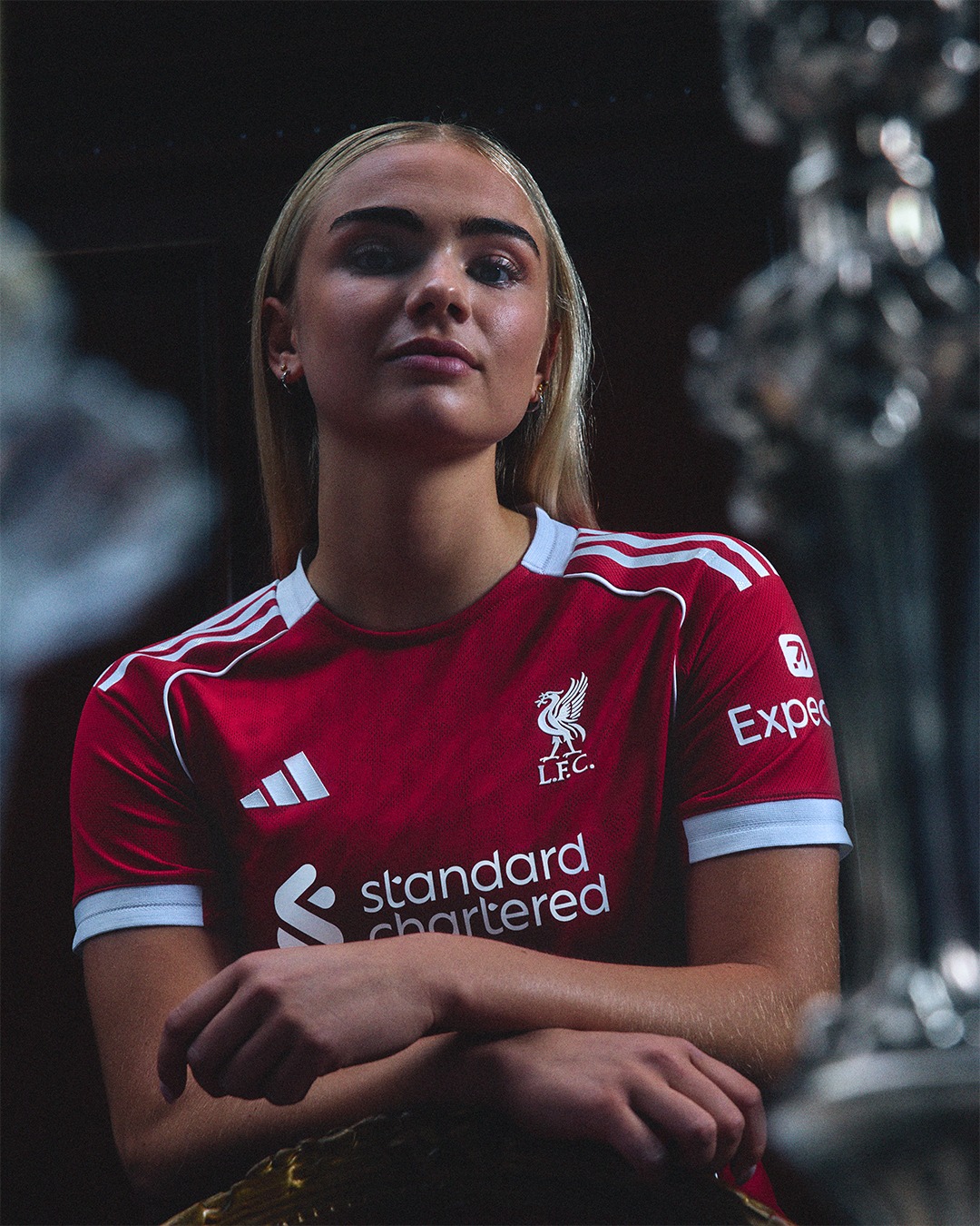 The kit is completed with matching red shorts and red socks, which feature white detailing including LFC initials and adidas logos. Both short-sleeve and long-sleeve versions are available. This release forms part of a wider reintroduction of adidas products to the Anfield side, with a focus on merging innovation with club tradition.