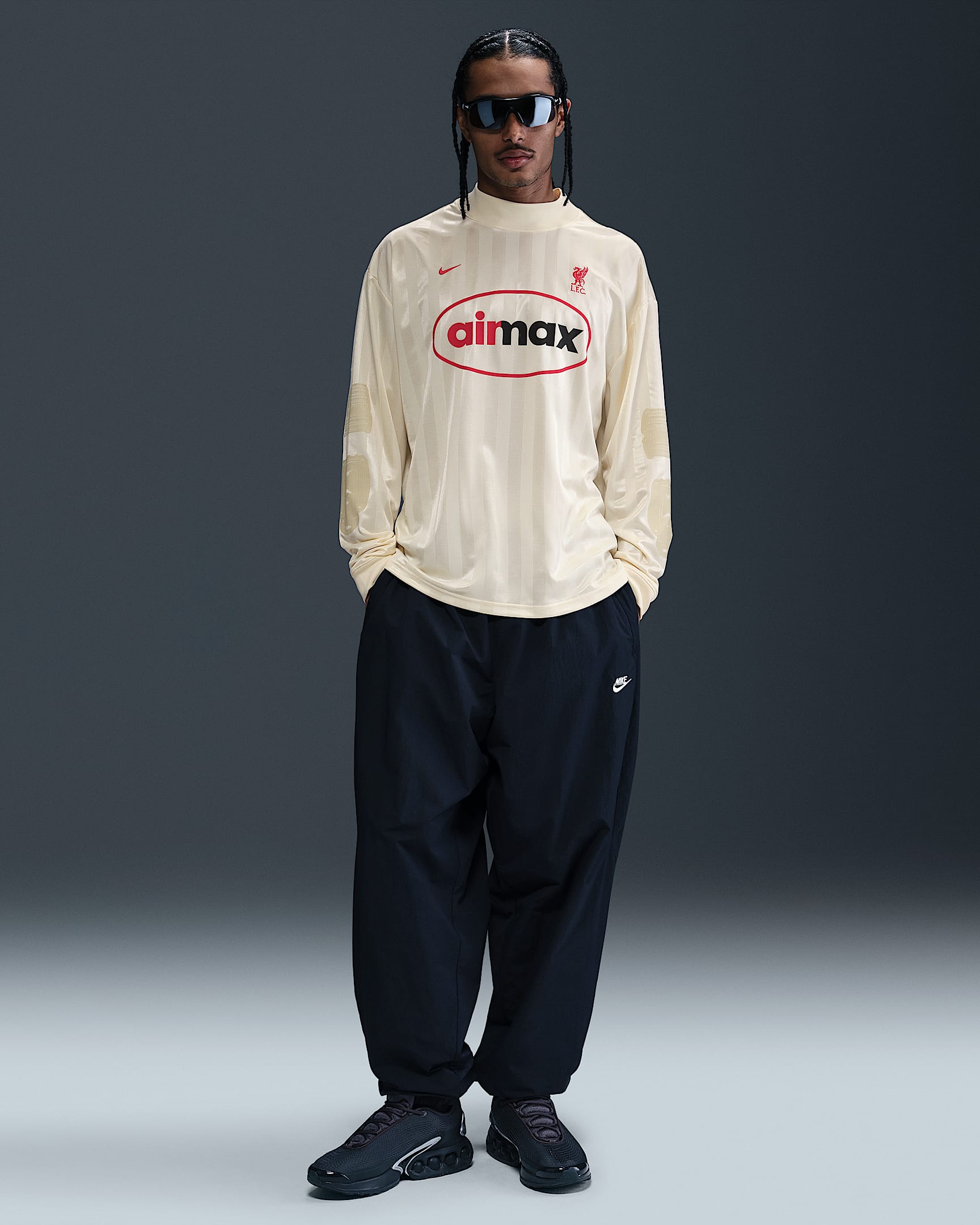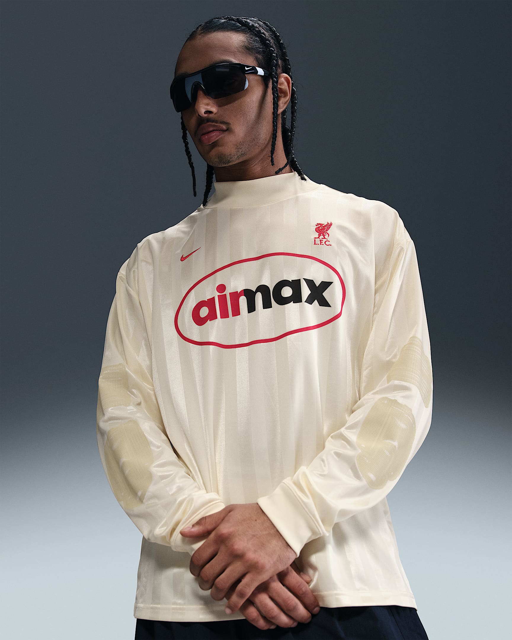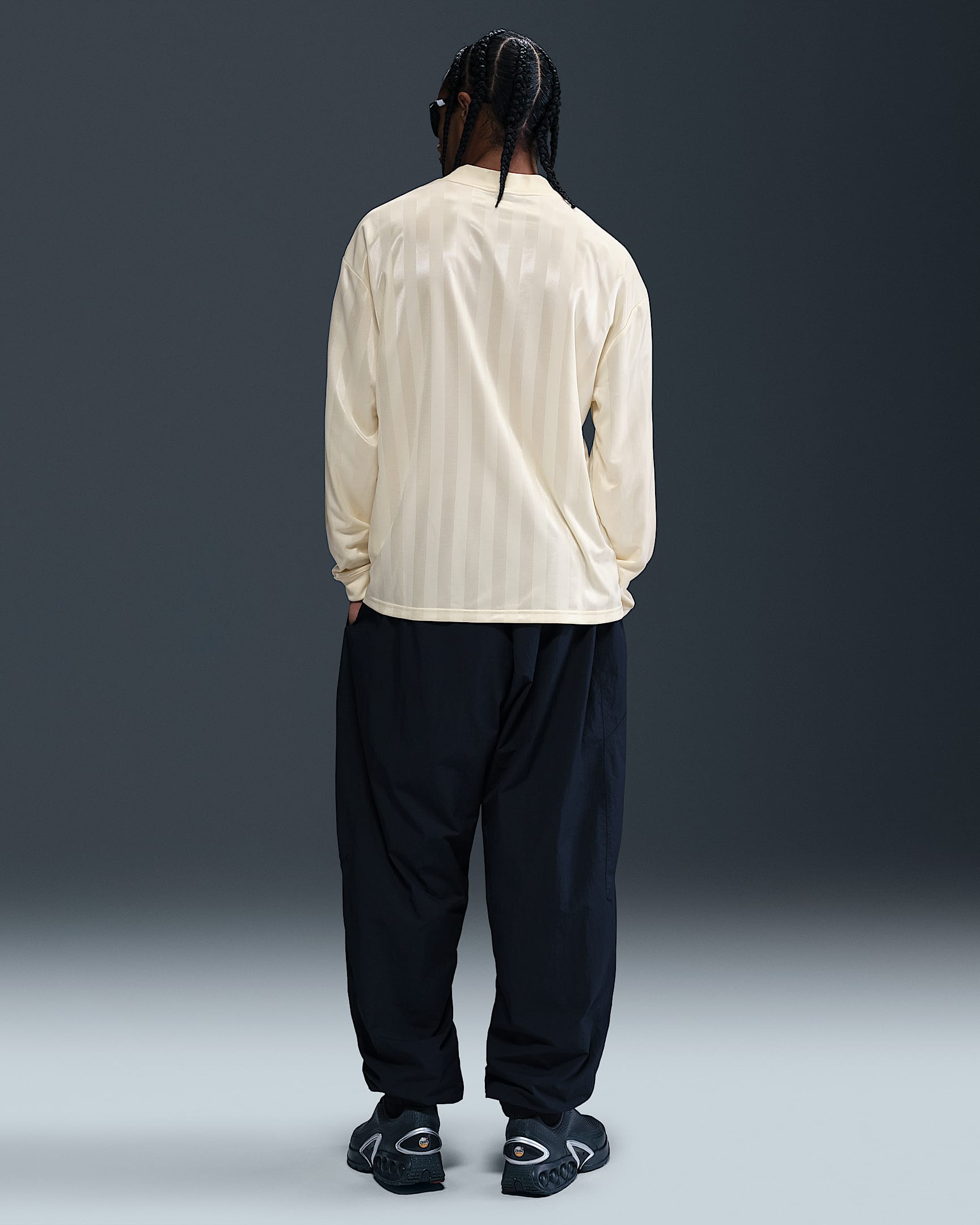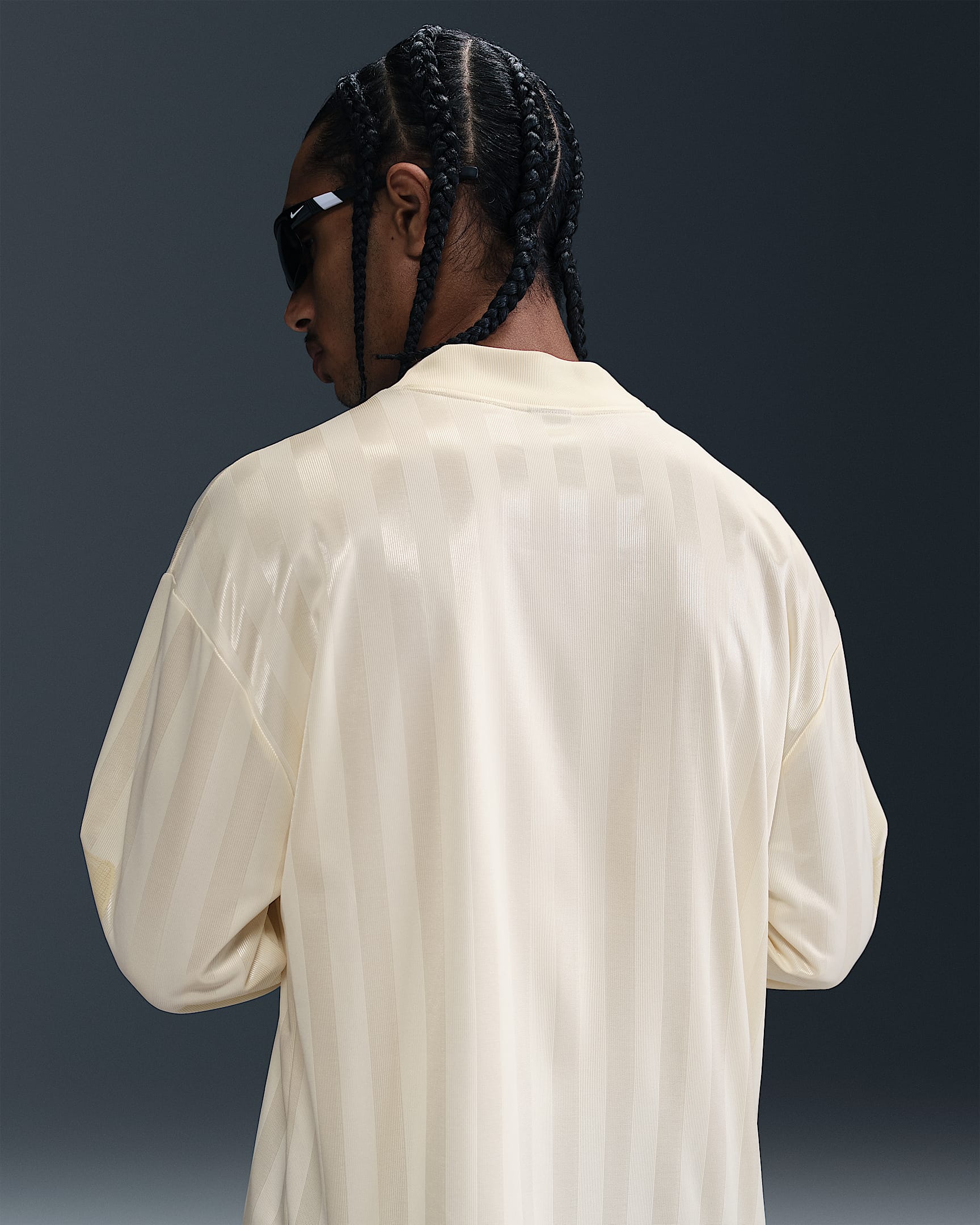 This loose-fit top draws inspiration from vintage goalkeeper jerseys and is constructed using Nike’s Dri-FIT fabric, which helps manage moisture. The shirt features a tonal Coconut Milk base with subtle vertical shiny stripes running down the body and sleeves.