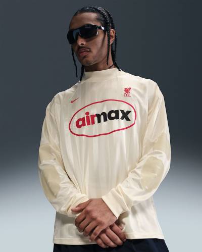 Additional details include padded elbow zones reminiscent of traditional keeper kits. The front displays a bold Gym Red and black “Air Max” logo in an oval shape, while the Nike Swoosh and LFC crest are embroidered in Gym Red on the chest.