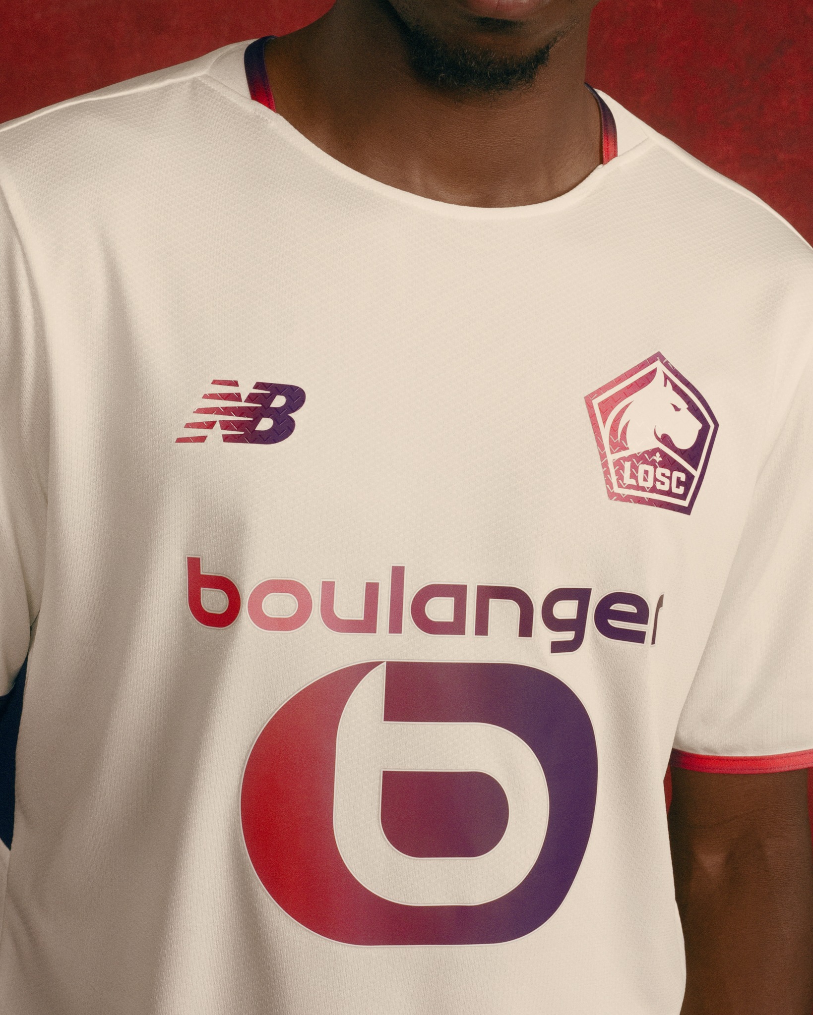The club crest, New Balance logo, and sponsor logos appear in a red to blue gradient across the chest, reflecting Lille’s traditional colours. On the back, the kit includes the “Fiers d’être des Dogues” emblem at the neck, while the gradient theme continues with a chevron element near the lower back.