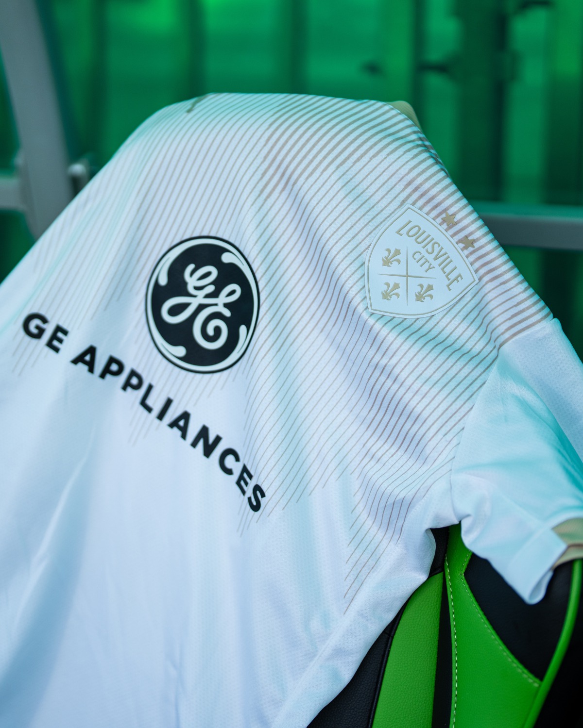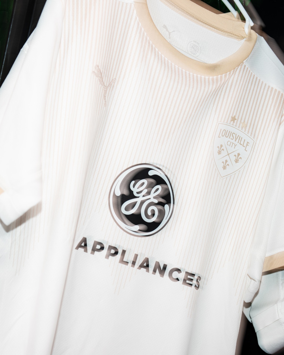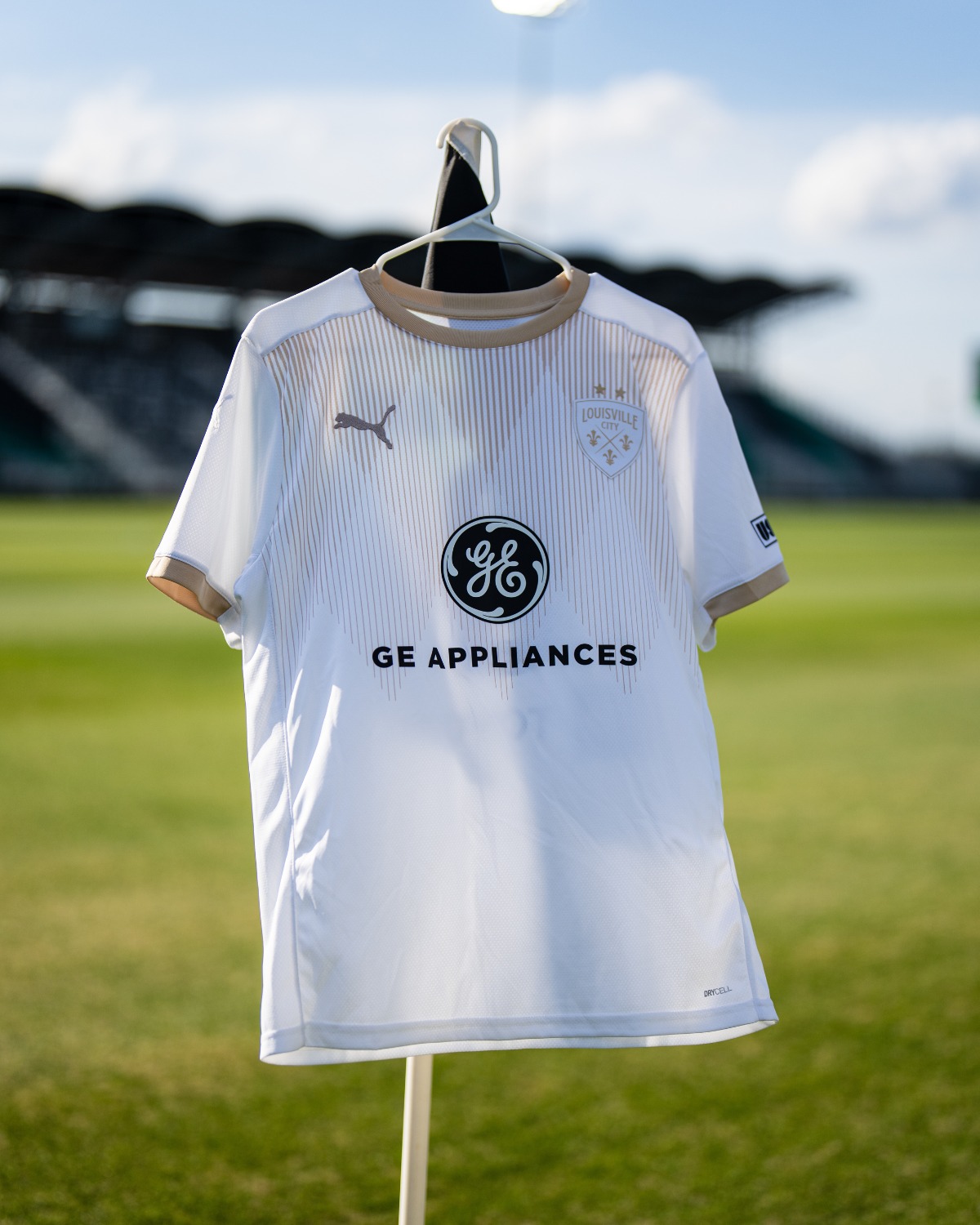 White forms the base of the new Louisville City jersey, with thin vertical stripes in a muted gold tone across the chest, while gold trim is also applied to the collar and sleeve cuffs. The Puma logo is positioned on the right chest, opposite the Louisville City crest which appears in a white and gold finish. Two gold stars sit above the crest, referencing the club’s USL Championship titles in 2017 and 2018.
