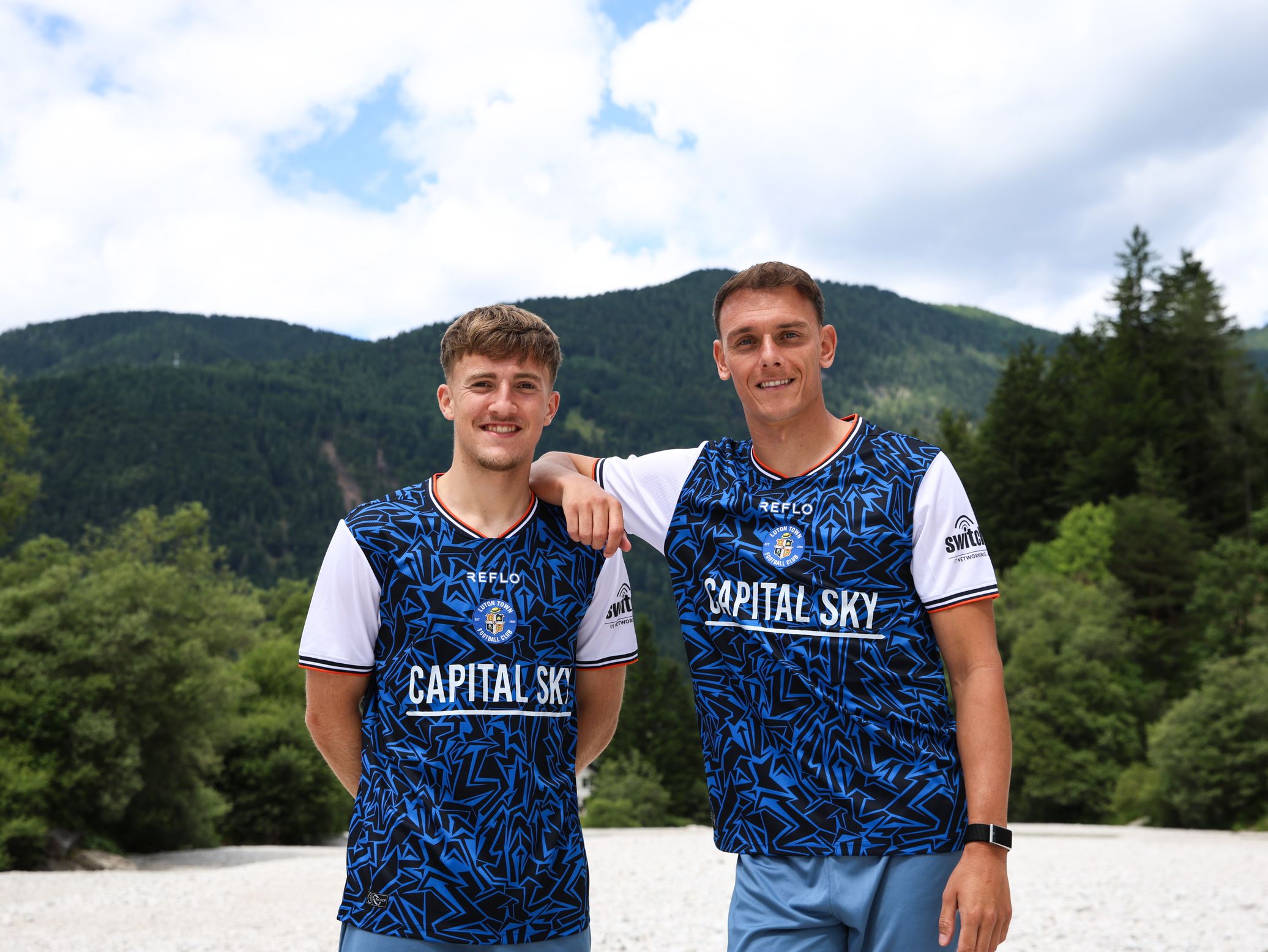 White sleeves provide contrast, finished with thin orange, white and black trim at the cuffs, while a matching collar follows the same colour detail. The club crest sits centrally on the chest with Reflo’s branding above and principal partner Capital Sky displayed below. Sleeve sponsor Switch Networks also appears on the right arm.