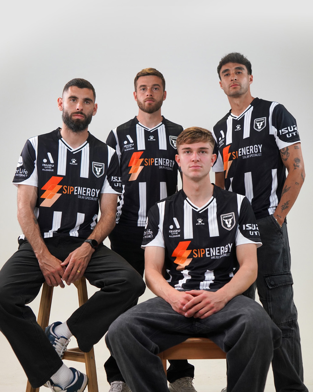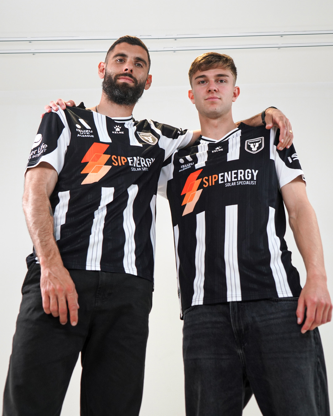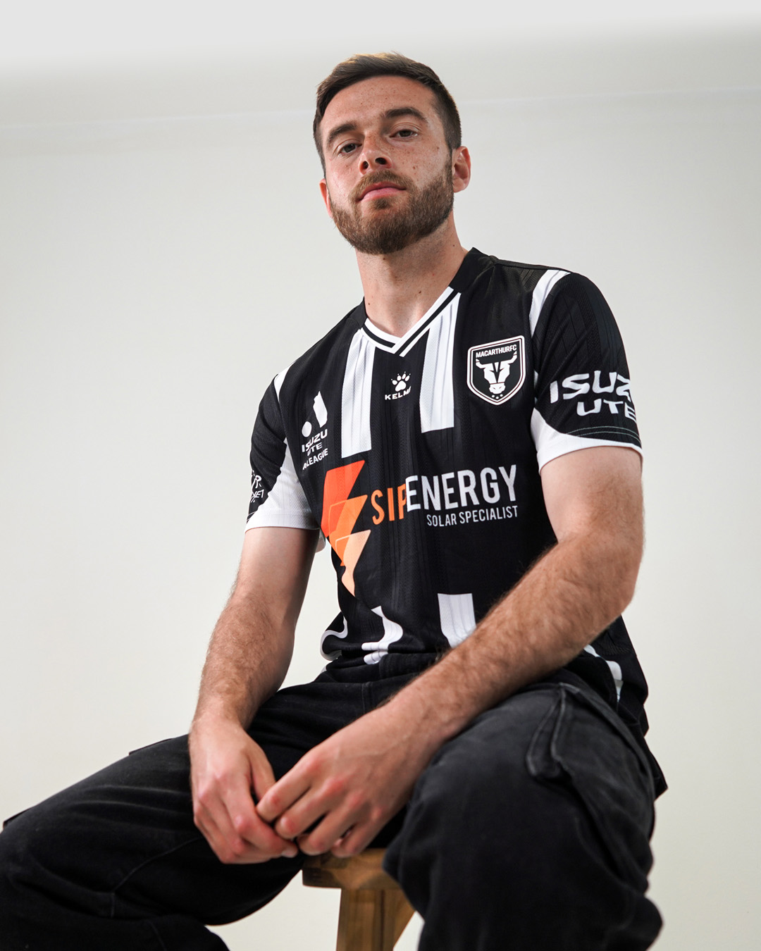 Macarthur FC have unveiled their new Home kit for the 25/26 Isuzu UTE A-League season, featuring black and white vertical stripes with contrasting white sleeves and a V-neck collar.