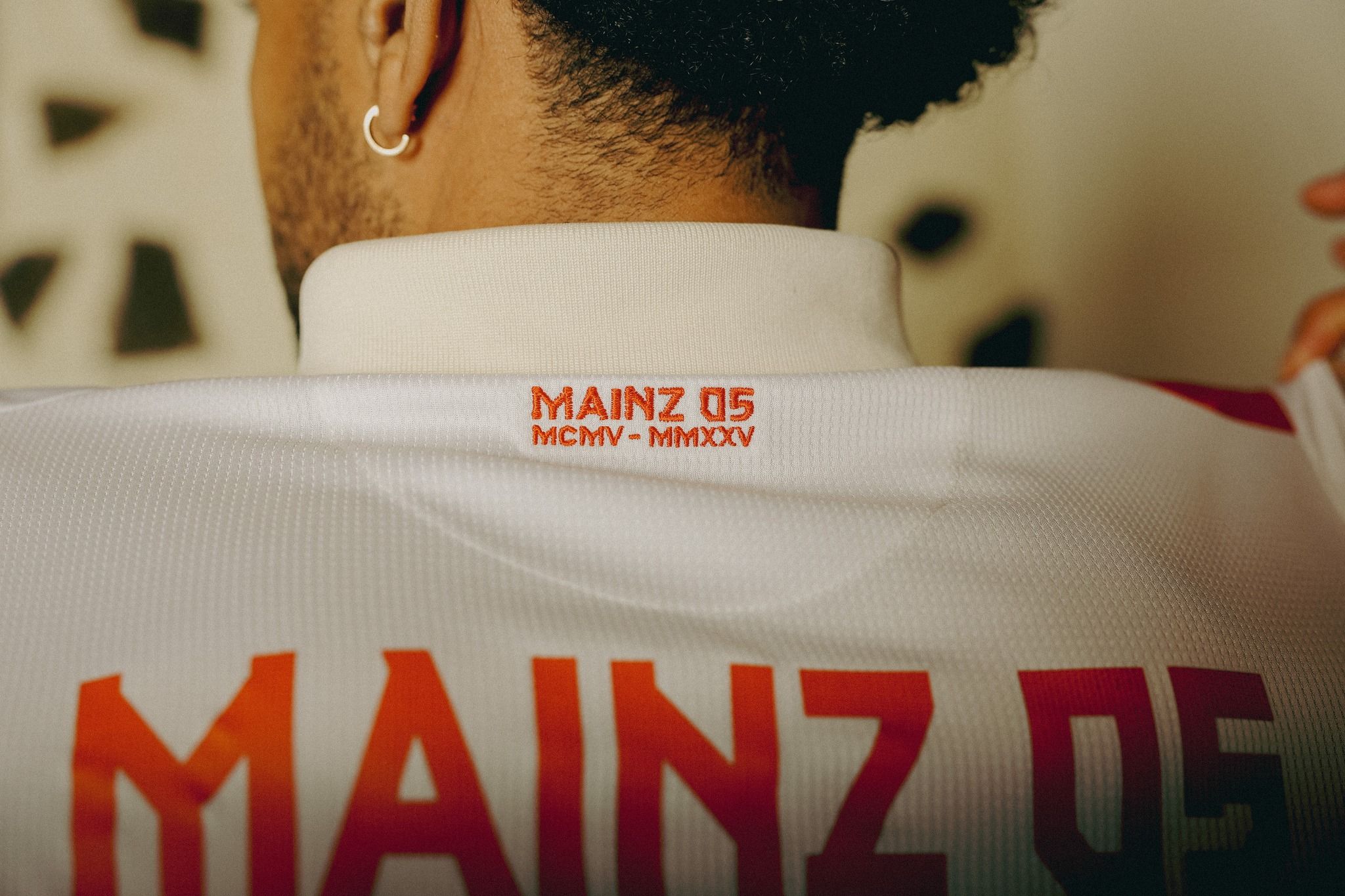 The shirt features an off-white base with a striking red sash across the front, reflecting the historical design. The Mainz wheel is embroidered on the chest in place of the modern club crest, mirroring the early days of the club when the current logo had not yet been introduced. The collar is a buttoned polo style, and the cuffs are ribbed for a vintage feel. Roman numerals marking the club’s founding year (1905) and the present year (2025) are printed on the back.