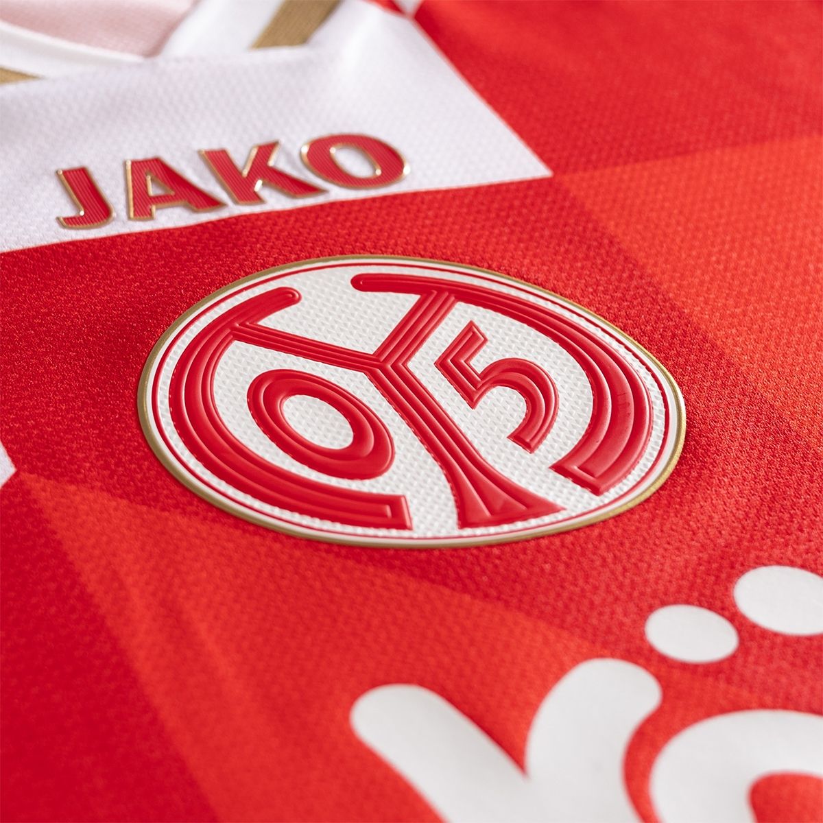 The shirt carries a red and white block pattern, arranged in a geometric style that continues across the back. Gold detailing appears on the V-neck collar and sleeve cuffs, symbolising Mainz as the golden city on the Rhine. The club crest is placed centrally beneath the JAKO wordmark, with sponsor branding from Kömmerling positioned underneath, linking back to the club’s first European campaign in 2005 and replicating the layout of that historic kit.