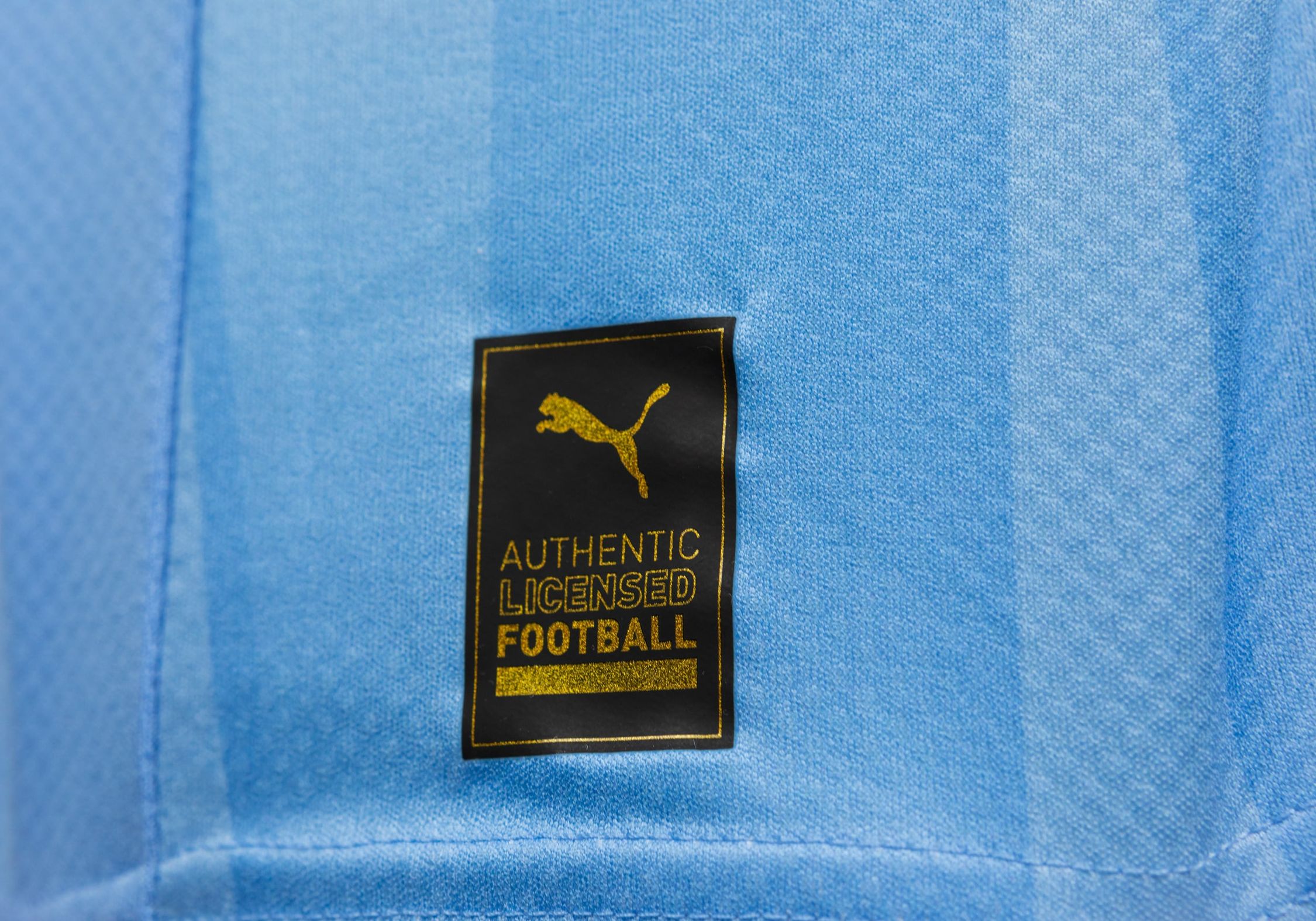 Featuring tonal stylised stripes in shades of light/sky blue, the 2023 shirt carries the crest in full standard form, while partner branding - including the unmistakable Volkswagen (VW) logo front and centre - contrast in white, matching the neck and cuffs.