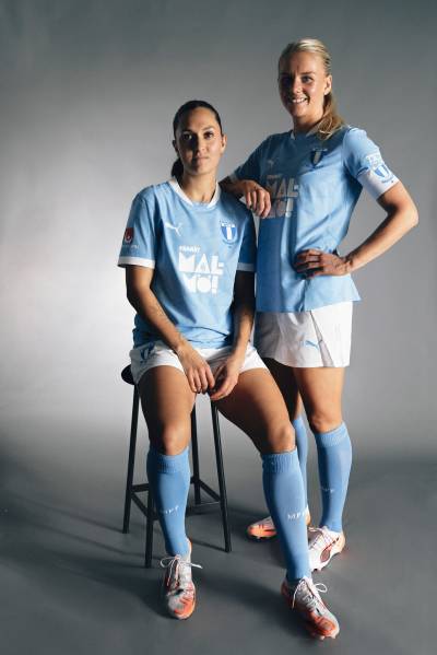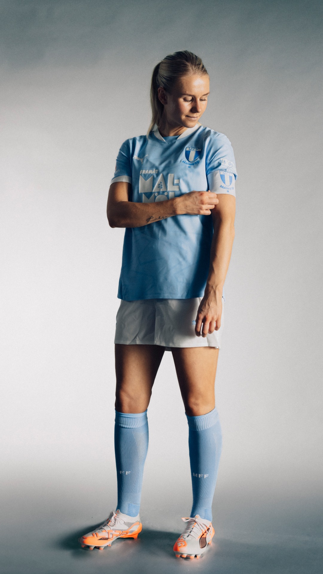The shirt has white cuffs and a white collar, with a white sponsor reading “FRAMÅT MALMÖ!” across the chest. Two stars sit proudly above the club crest, and the Scanian cross flag appears on the back neck, marking regional pride. The look is completed with white shorts and sky-blue socks