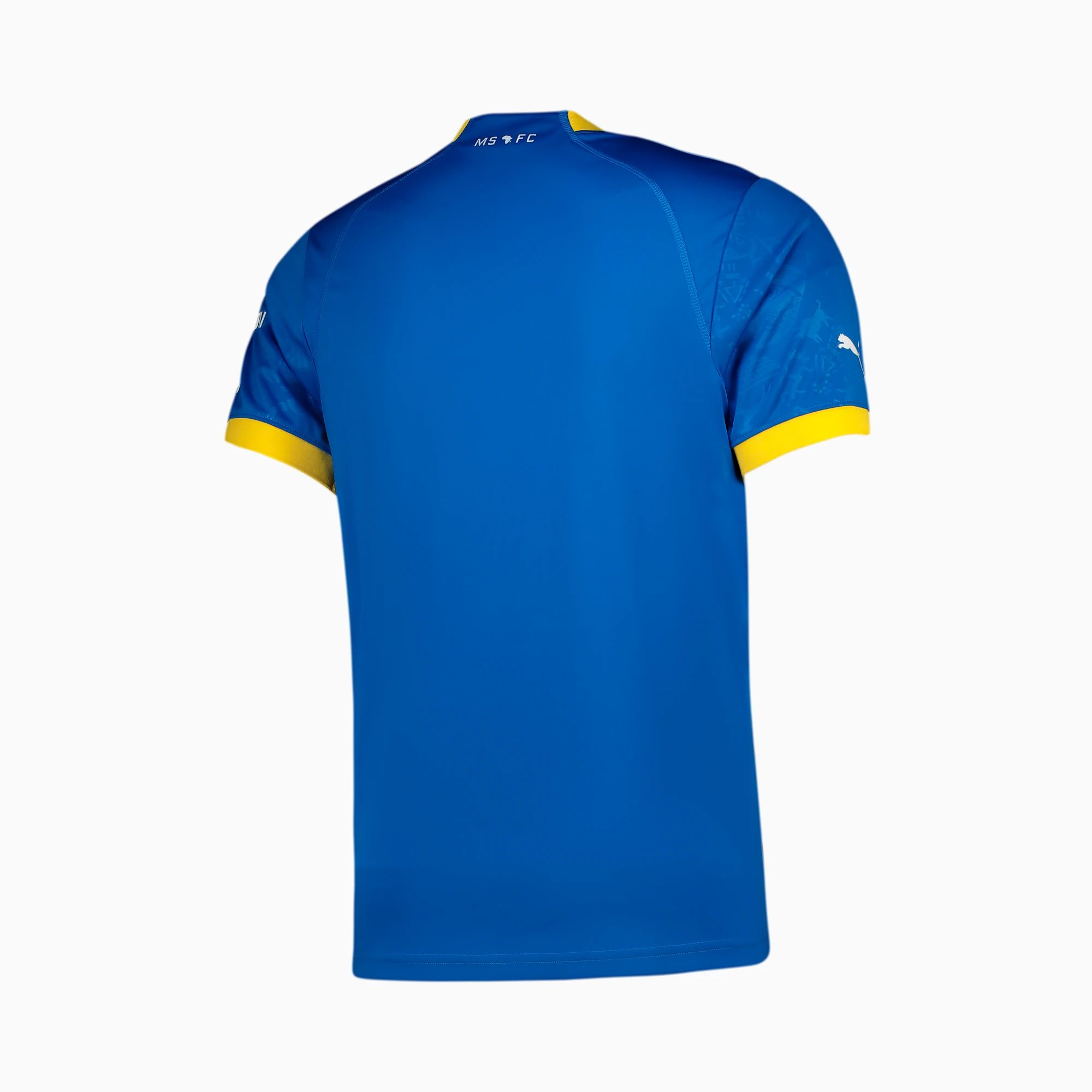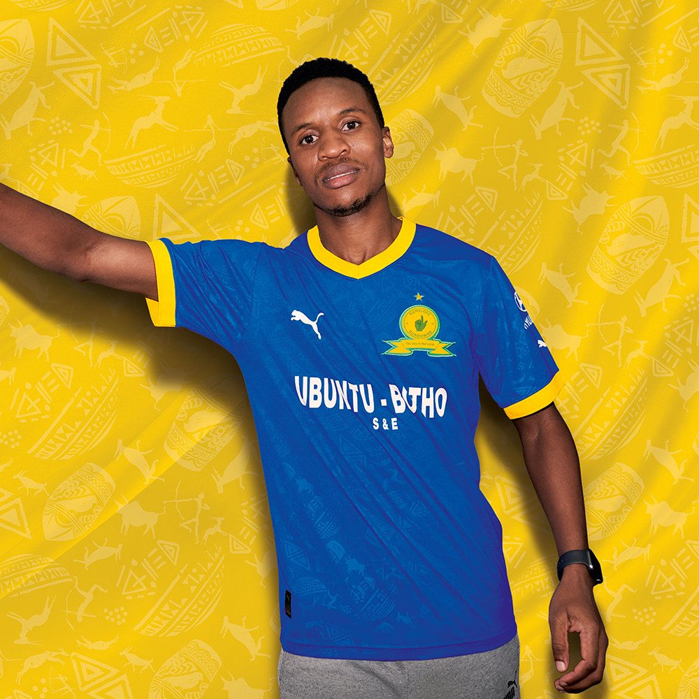 This is in contrasting white, as is all partner branding, while the crest is in full colour, the neck and cuffs are in yellow, and the South African DStv Premiership champions’ kit is completed with white shorts and blue socks.