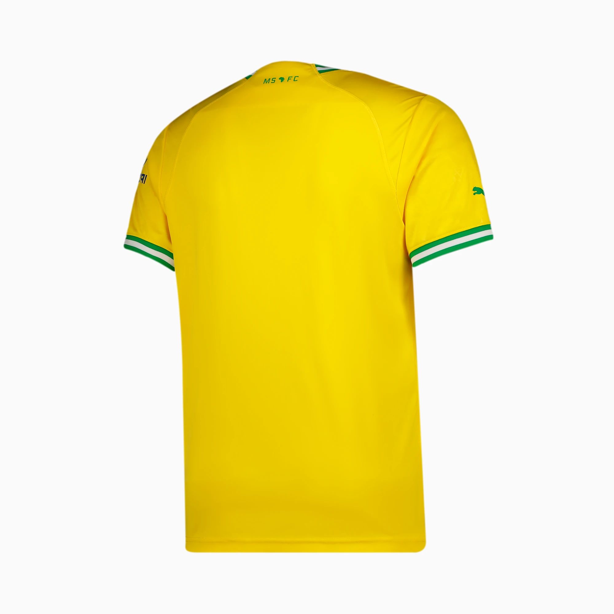 The new Puma release is in yellow with green-and-white trim, coming in the form of the neat V-neck and cuffs.