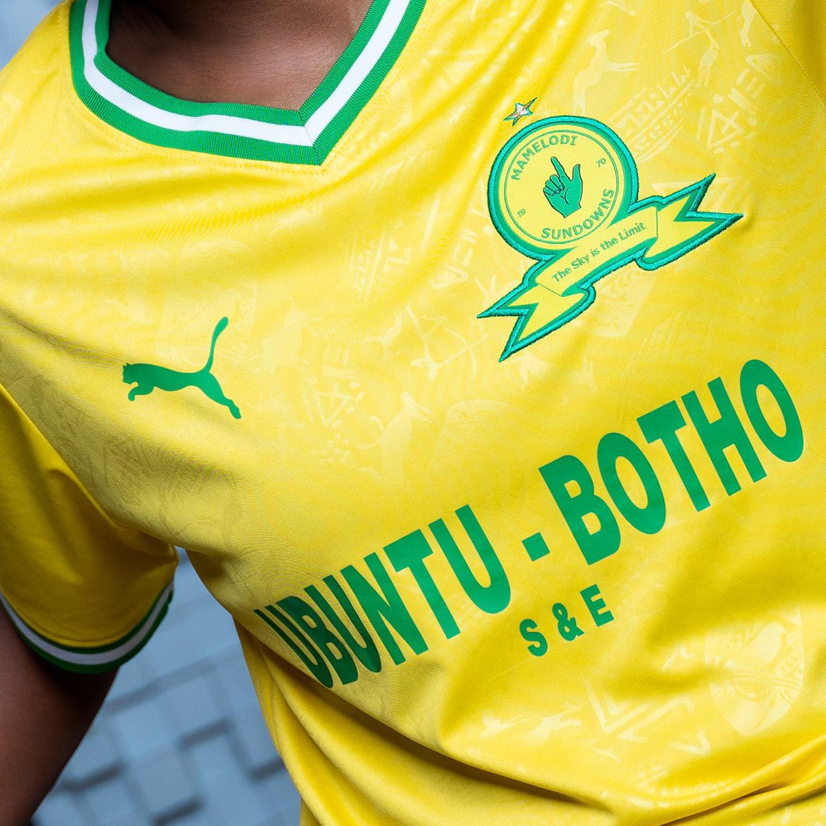 Detailing - the Puma cat logos and the main sponsor print - is in the aforementioned green, while the crest appears in its standard form, and all this is overlaid upon a debossed fabric which includes depictions of calabashes, antelope, drums, pyramids and warriors, telling the story of Sundowns’ previous adventures across the continent.