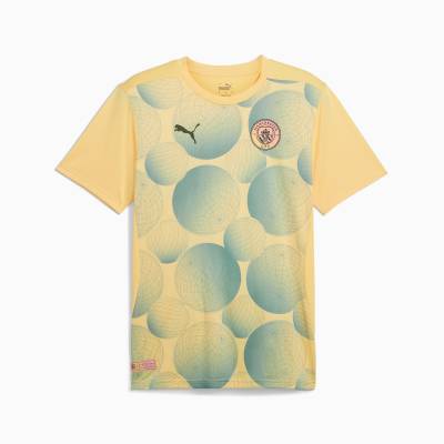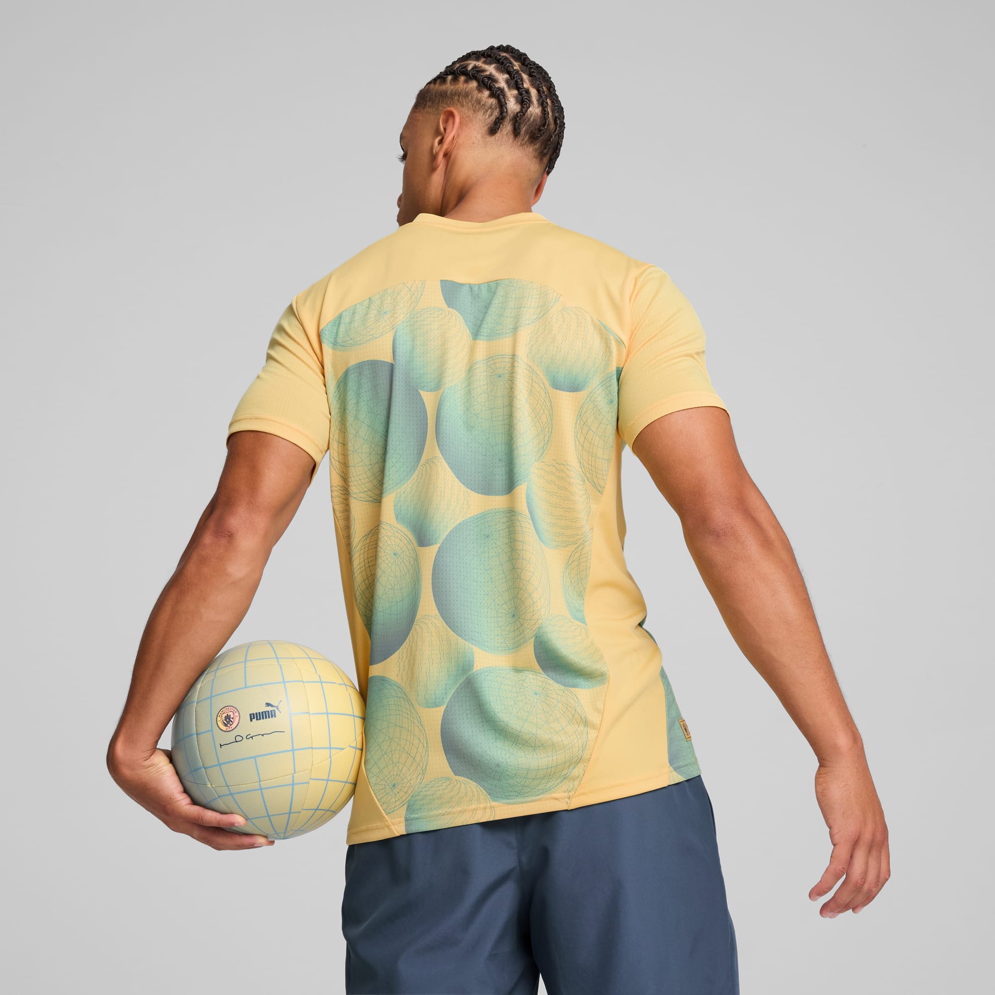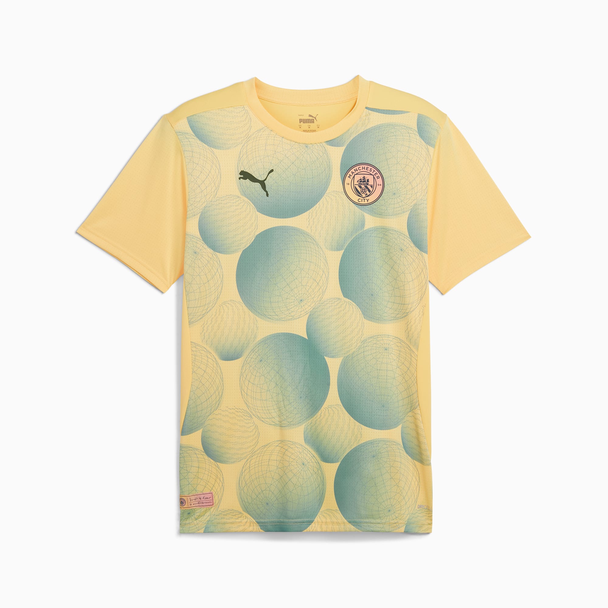 The 2024-25 “Flaxen” and “Bold Blue” Puma warmup shirt is decorated with globes - a nod to Oasis’s “Definitely Maybe” debut album, as the 30th anniversary of the debut of which is being celebrated this year - and there is a Noel Gallagher signature tag near the hem.