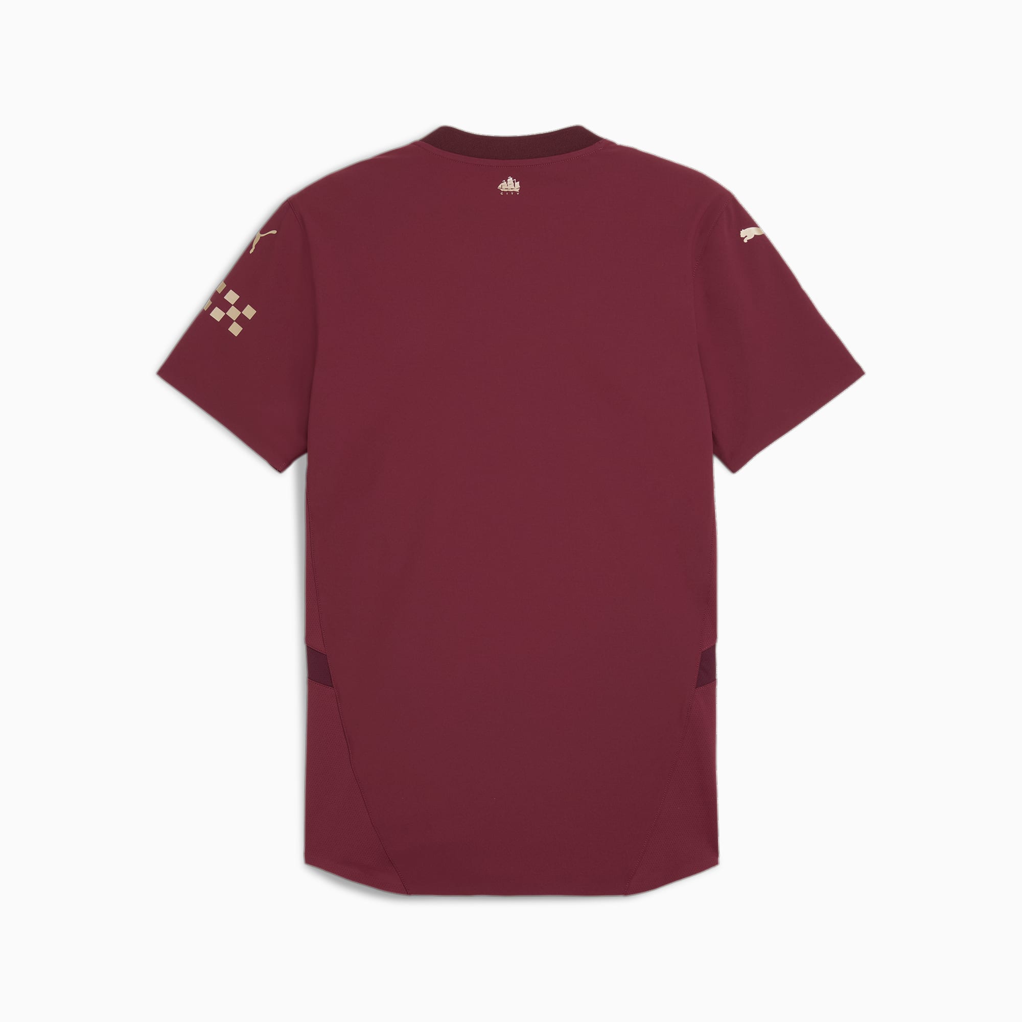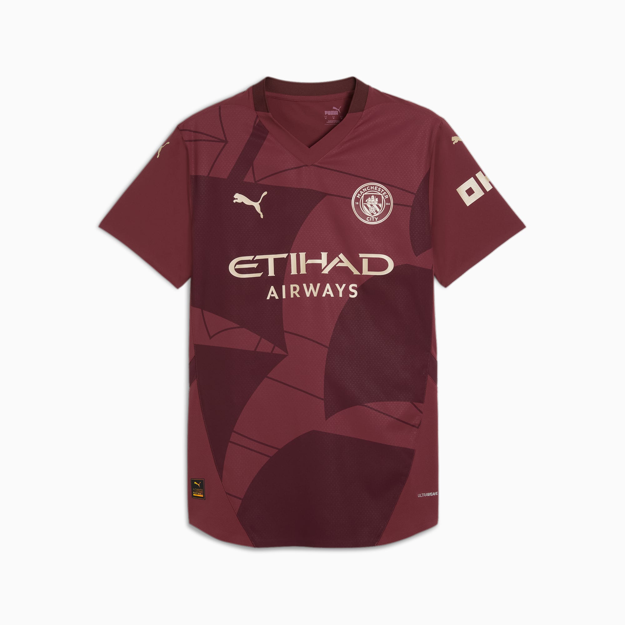 First revealed in New York during the club's 2024 USA Tour, the burgundy (Dark Jasper) kit features metallic gold trims, symbolising constant movement both on and off the pitch. The ship from the Manchester City crest is reimagined as an all-over tonal graphic, representing the club's past, present, and future.