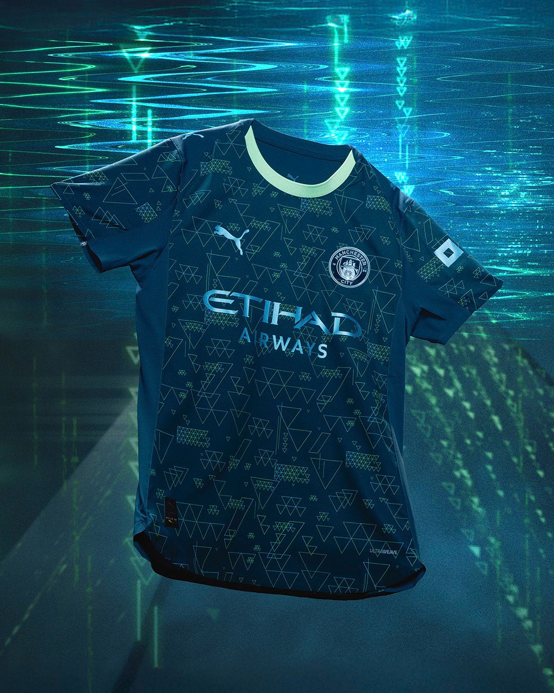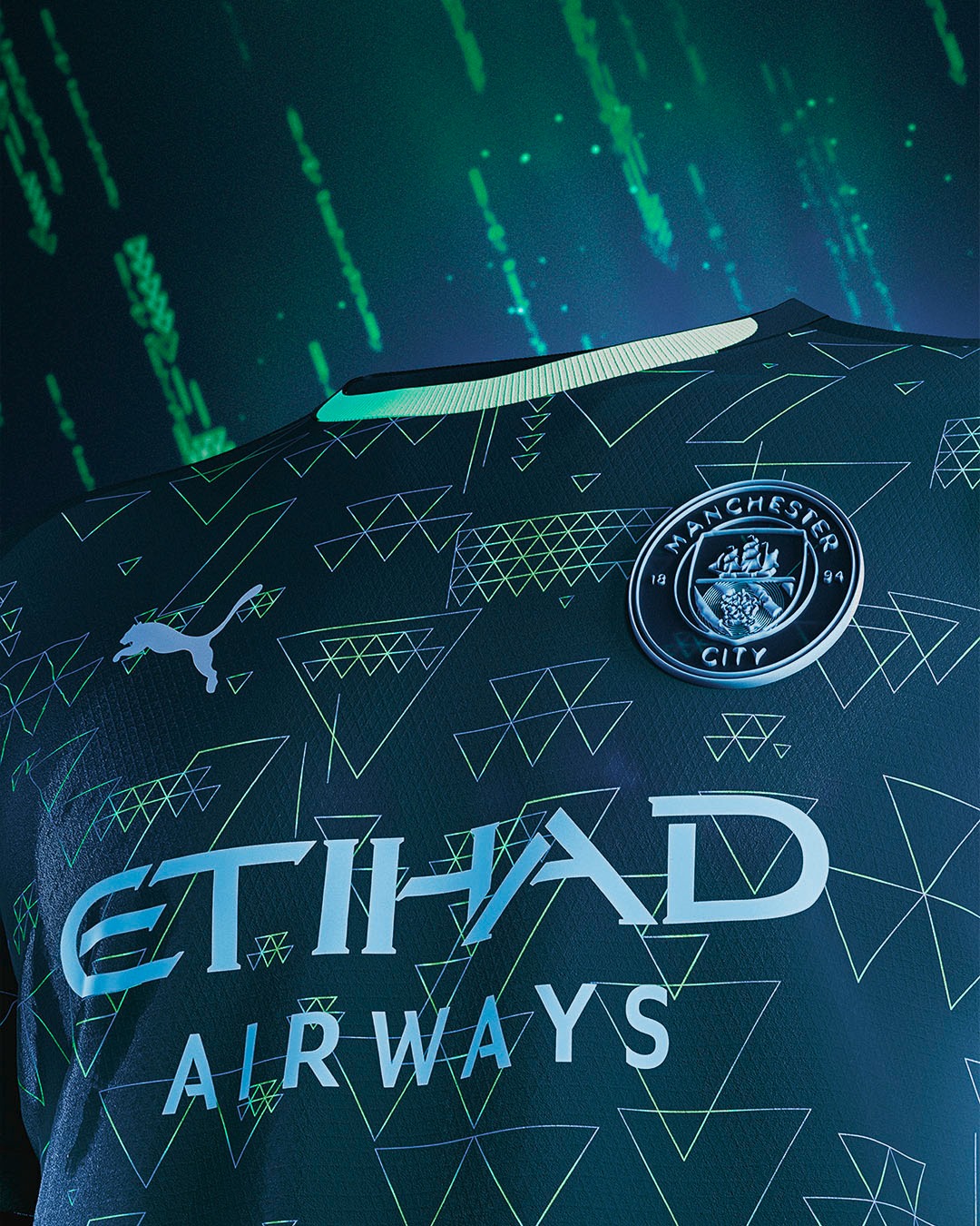 The Puma design centres around the triangle, a symbol associated with the EA FC brand and reflective of City’s style of play. Presented in a dark forest green tone, the shirt incorporates a mix of metallic and turquoise triangular line graphics across the front and sleeves. The club crest features a metallic finish, alongside a Puma logo and Etihad Airways sponsor in matching tones. A light green crew neck collar completes the look.