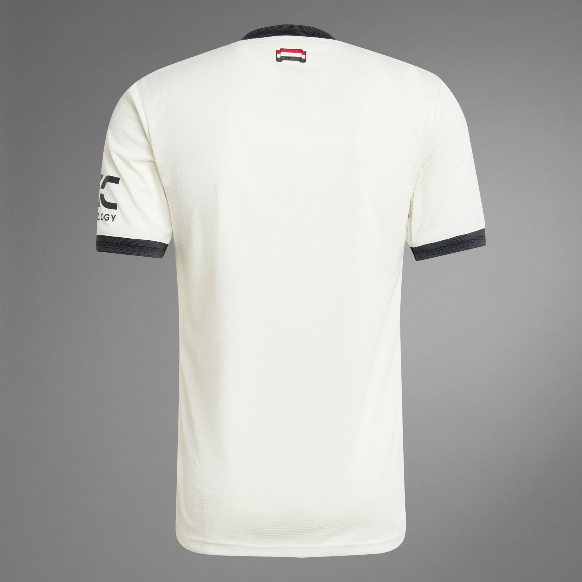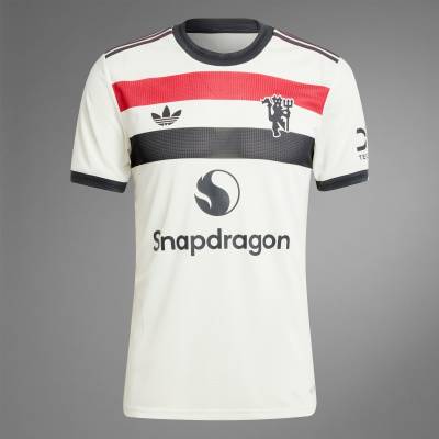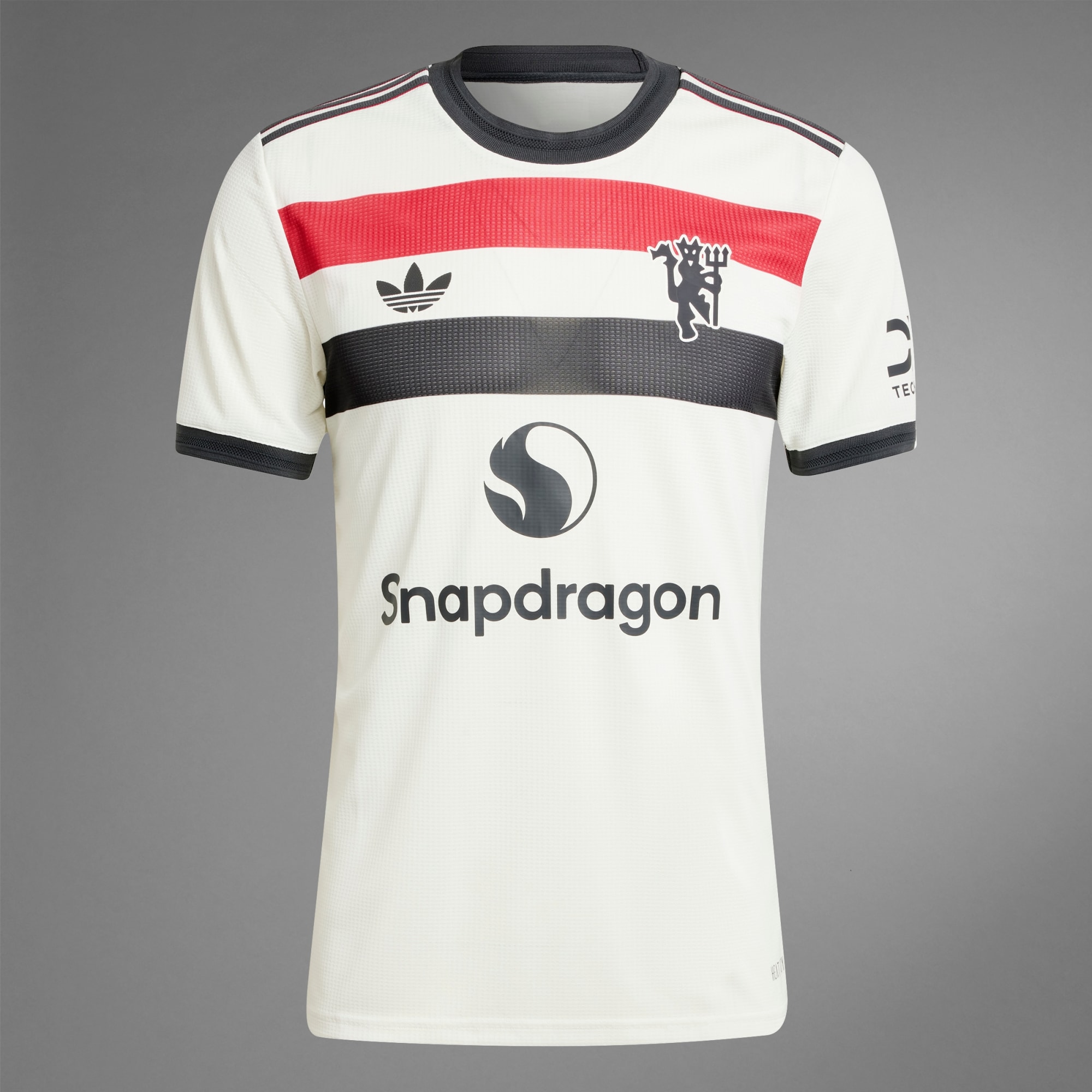 Most notably carrying the Trefoil logo of the German supplier instead of the now-standard “3-Bar” emblem - to celebrate “The Brand With the Three Stripes”’ 75th birthday in 2025 - the Red Devils’ 2024-25 tertiary release is in off-white with a fan-flag-style chest band bringing in red and black.