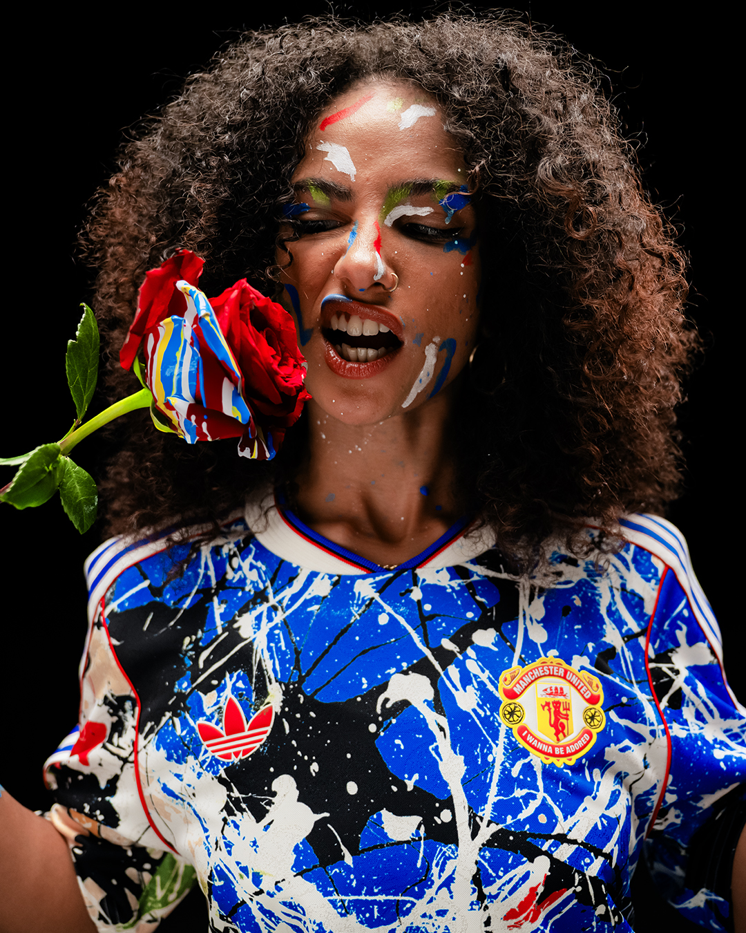 The Manchester United Stone Roses jersey features an all-over graphic print applied across the front, sleeves and back. The artwork references imagery linked to the band’s "I Wanna Be Adored" single sleeve, originally created by John Squire, with layered paint splatter effects and contrasting colour blocks appearing throughout the shirt.