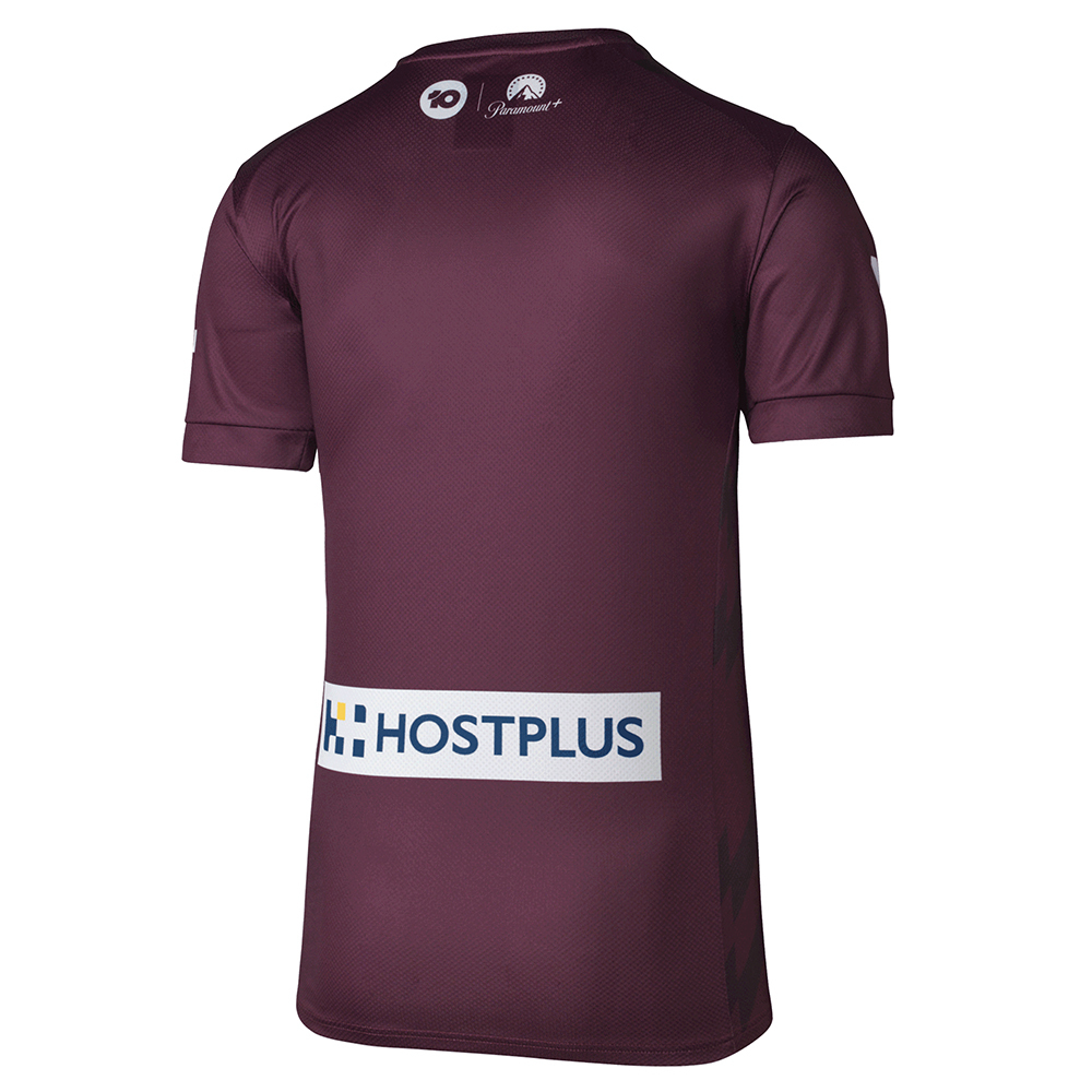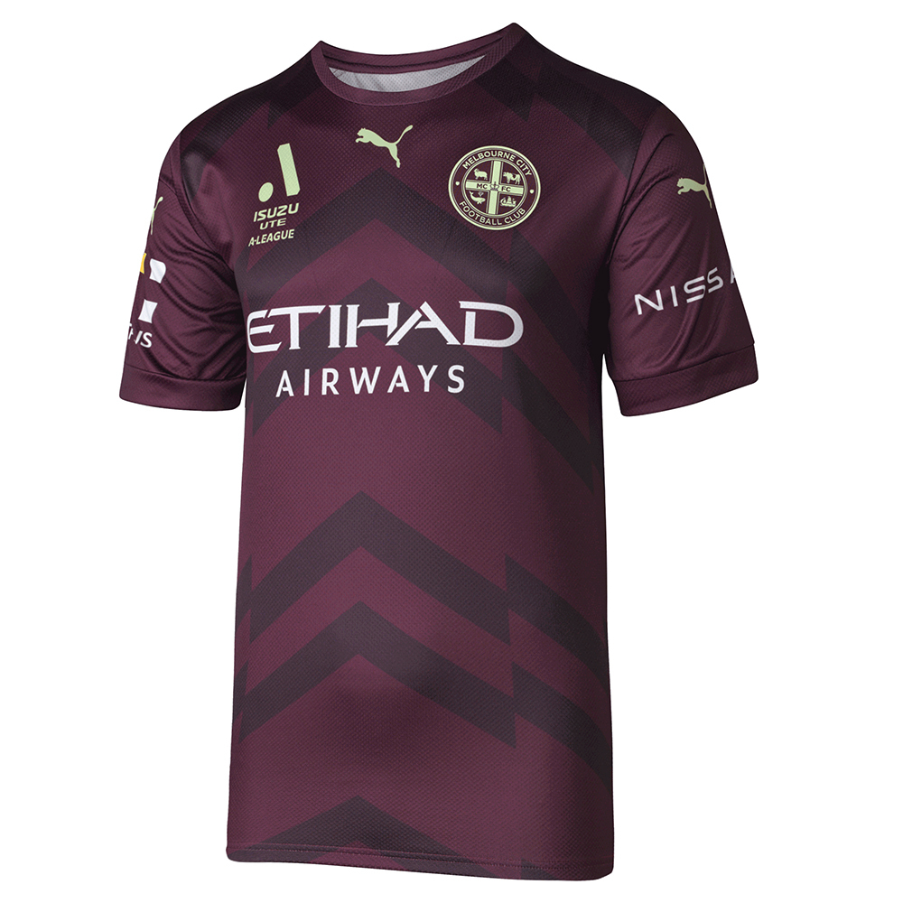 The shirt has a grape wine base with striking fizzy light accents and shows the Melbourne City FC crest on the left chest with sublimated PUMA Cat central on the chest, additionally, the A-League badge sits on the right chest.