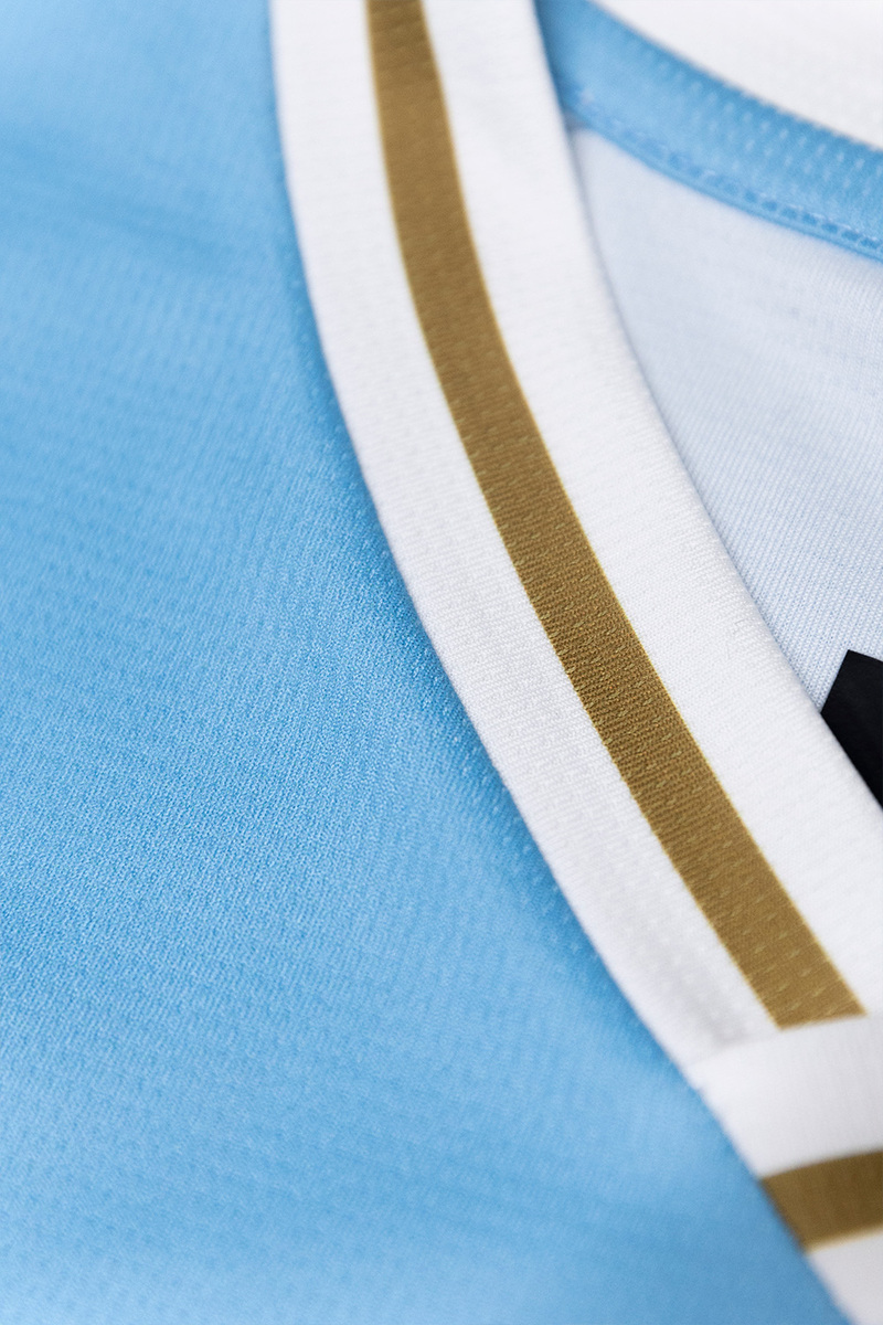Produced by Puma, the relatively understated first-choice release for the continental campaign sees a sky-blue base combined with gold-trimmed neck and cuffs, with similar augmentation applied to the dark change - with sky blue replacing the gold.
