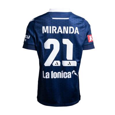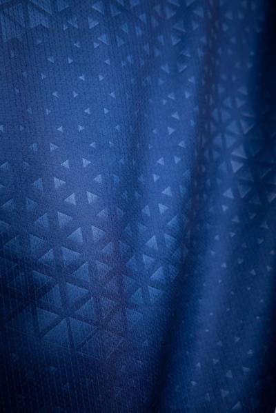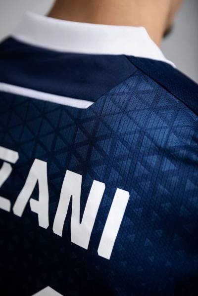 The 2023-24 primary design is in navy blue with the famous chest chevron returning to full-contrast white and somewhat echoing the look of the supplier’s “Hero” logo just above.