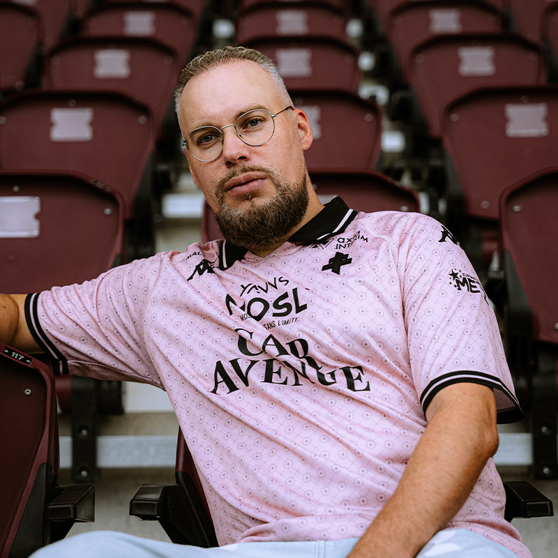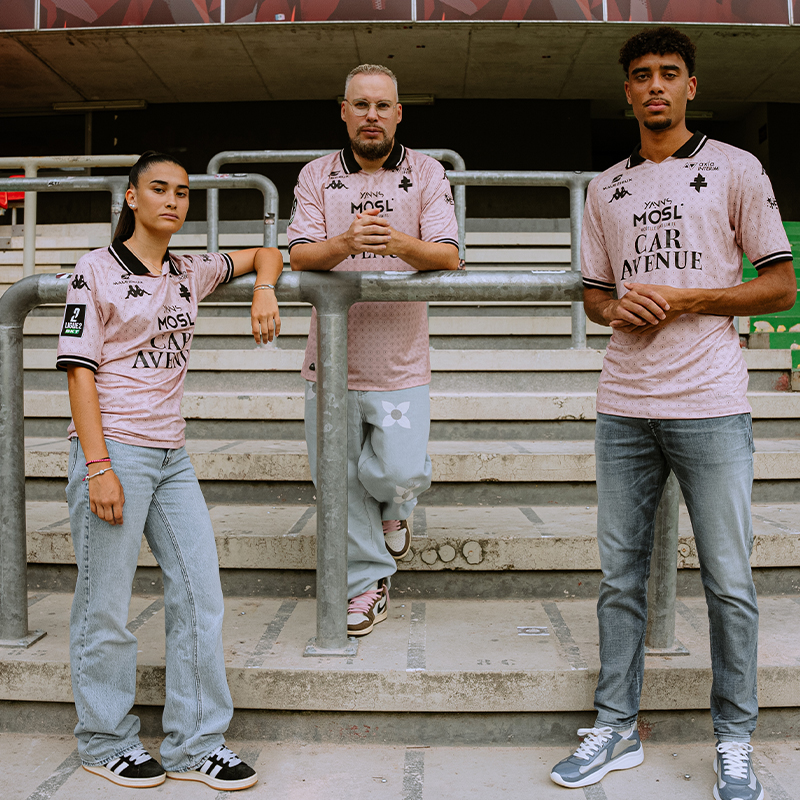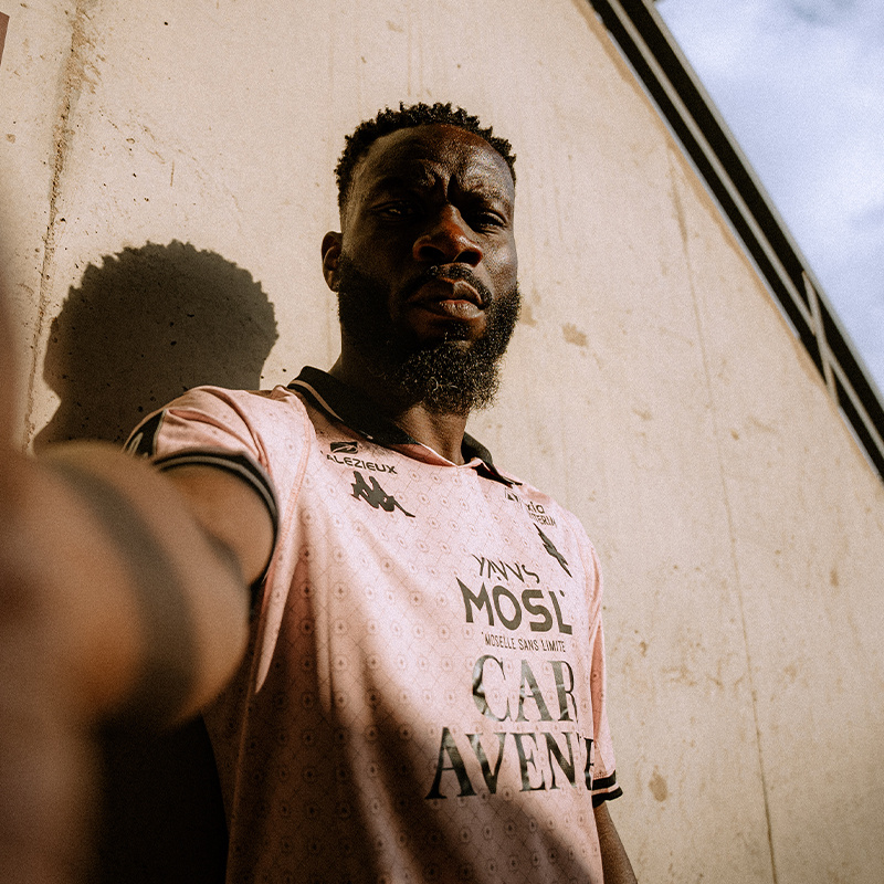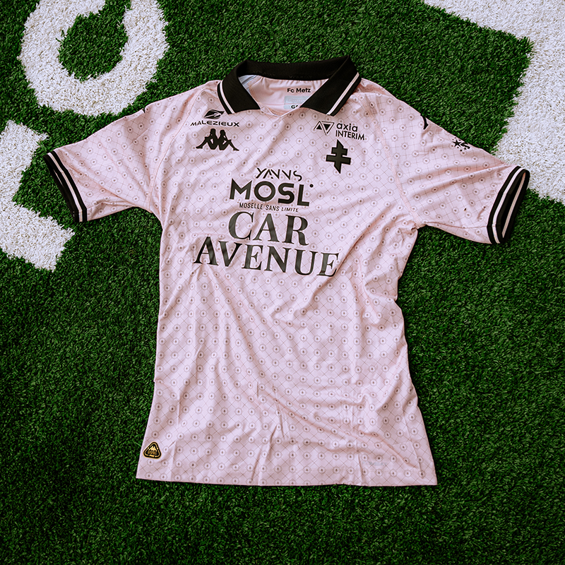The latest secondary change for Les Grenats is in pink with black trim and detailing and a base pattern inspired by the architecture of the city of Metz and featuring repetition of the local Croix de Lorraine (Cross of Lorraine) that also doubles up as FC Metz’s crest here.