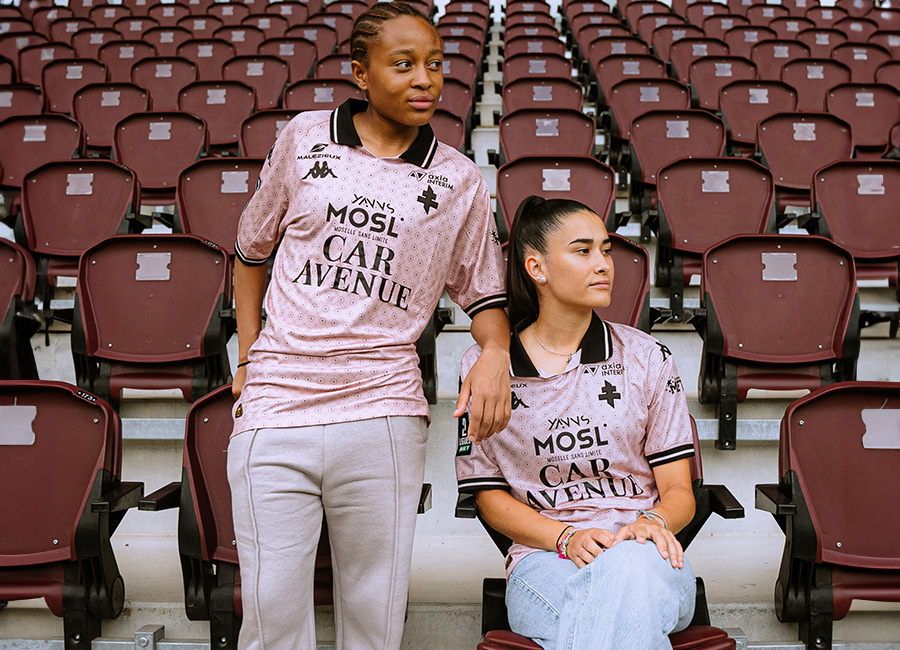 The latest secondary change for Les Grenats is in pink with black trim and detailing and a base pattern inspired by the architecture of the city of Metz and featuring repetition of the local Croix de Lorraine (Cross of Lorraine) that also doubles up as FC Metz’s crest here.