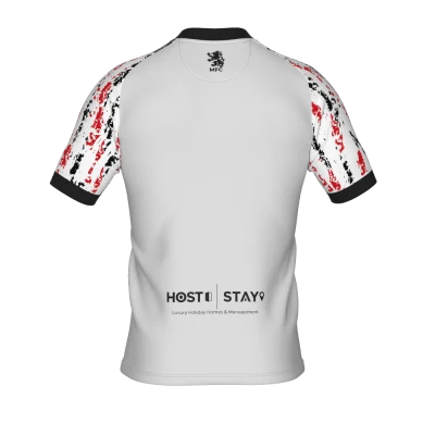 The white shirt features a red and black pattern across the shoulders based on the iconic Boro lion. White shorts and socks, each with black trim, complete the ensemble.