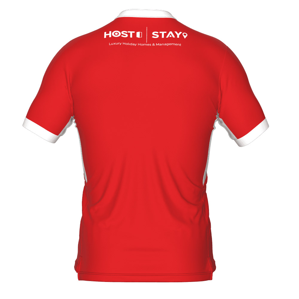 The traditional red home shirt features a mandarin collar with white placket and buttons, with the signature white band extending to under the arms, the white band adorns the logo of principal partner unibet and on the reverse of the shirt bears the branding of club partner Host & Stay.