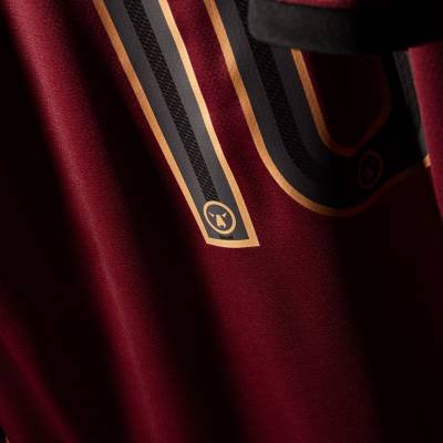 Embellishment is in black and gold and the kit is completed with black shorts and socks in the deep red.