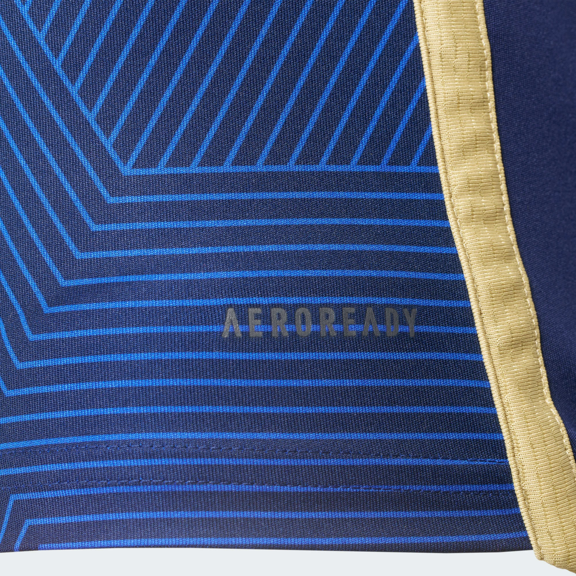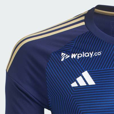 With a royal-blue trefoil-cum-honeycomb pattern overlaying the deep/navy-blue base on the trunk, the Colombian Categoría Primera A side’s 2024 primary release has a crest in full colour with sparing use of gold that is echoed in the German supplier’s shoulder striping and side-of-trunk trim.