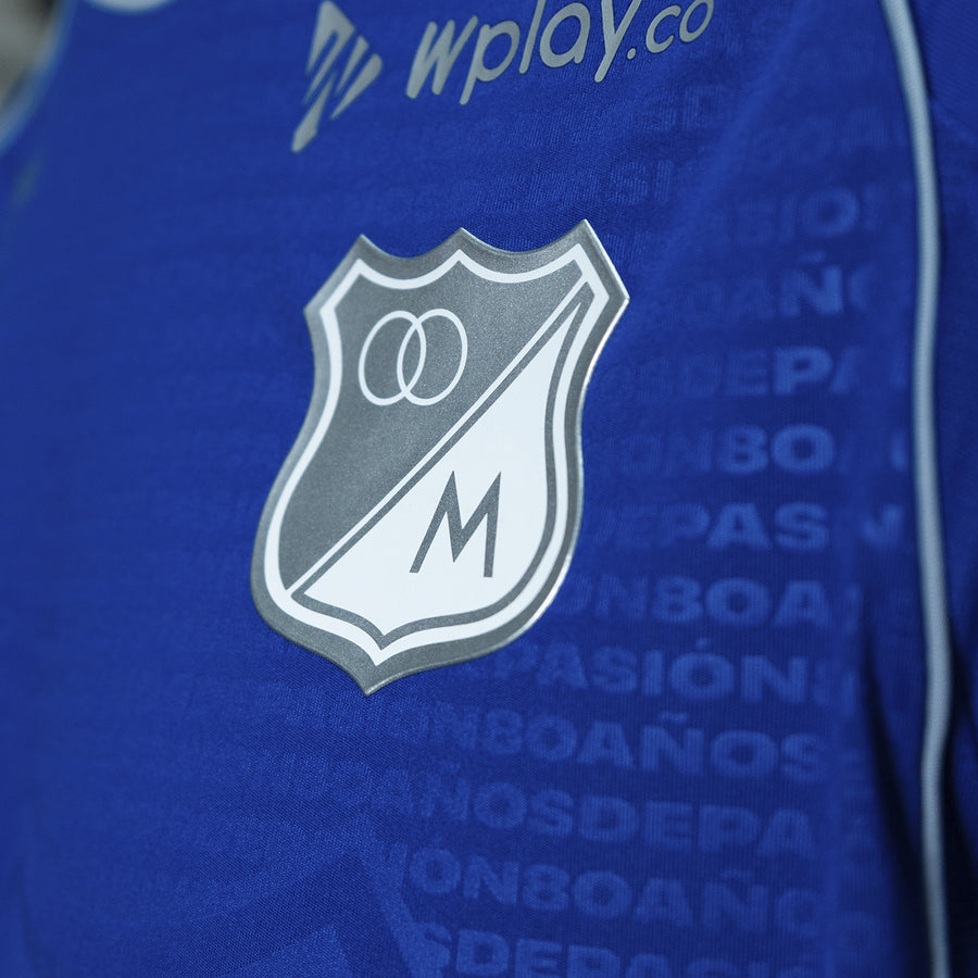 The Millonarios jersey comes in the club’s traditional blue colourway with grey detailing across the kit. A large scale club crest is integrated into the front of the shirt, with the surrounding pattern referencing architectural elements linked to El Campín stadium.
