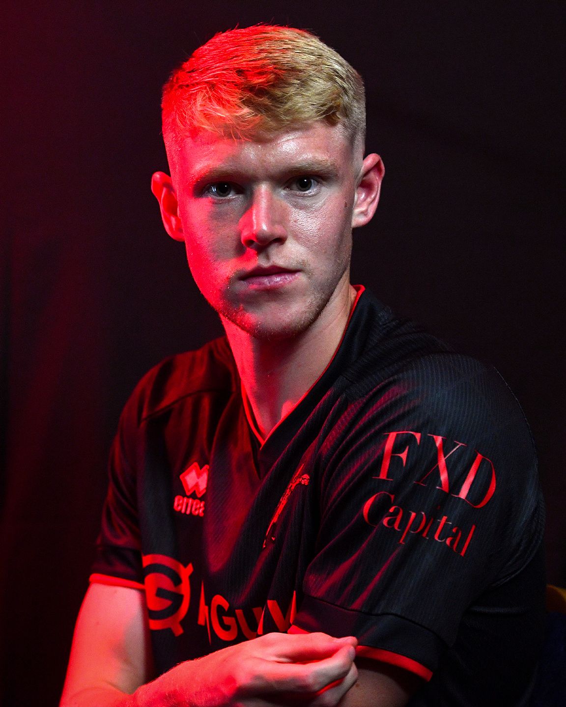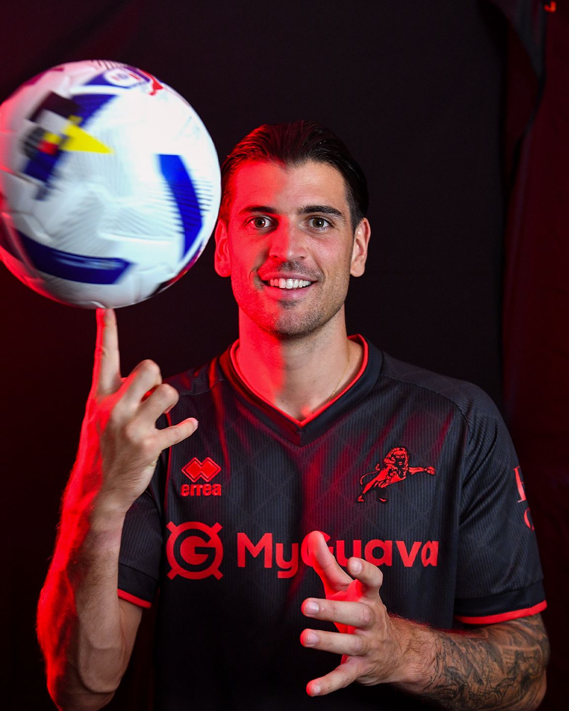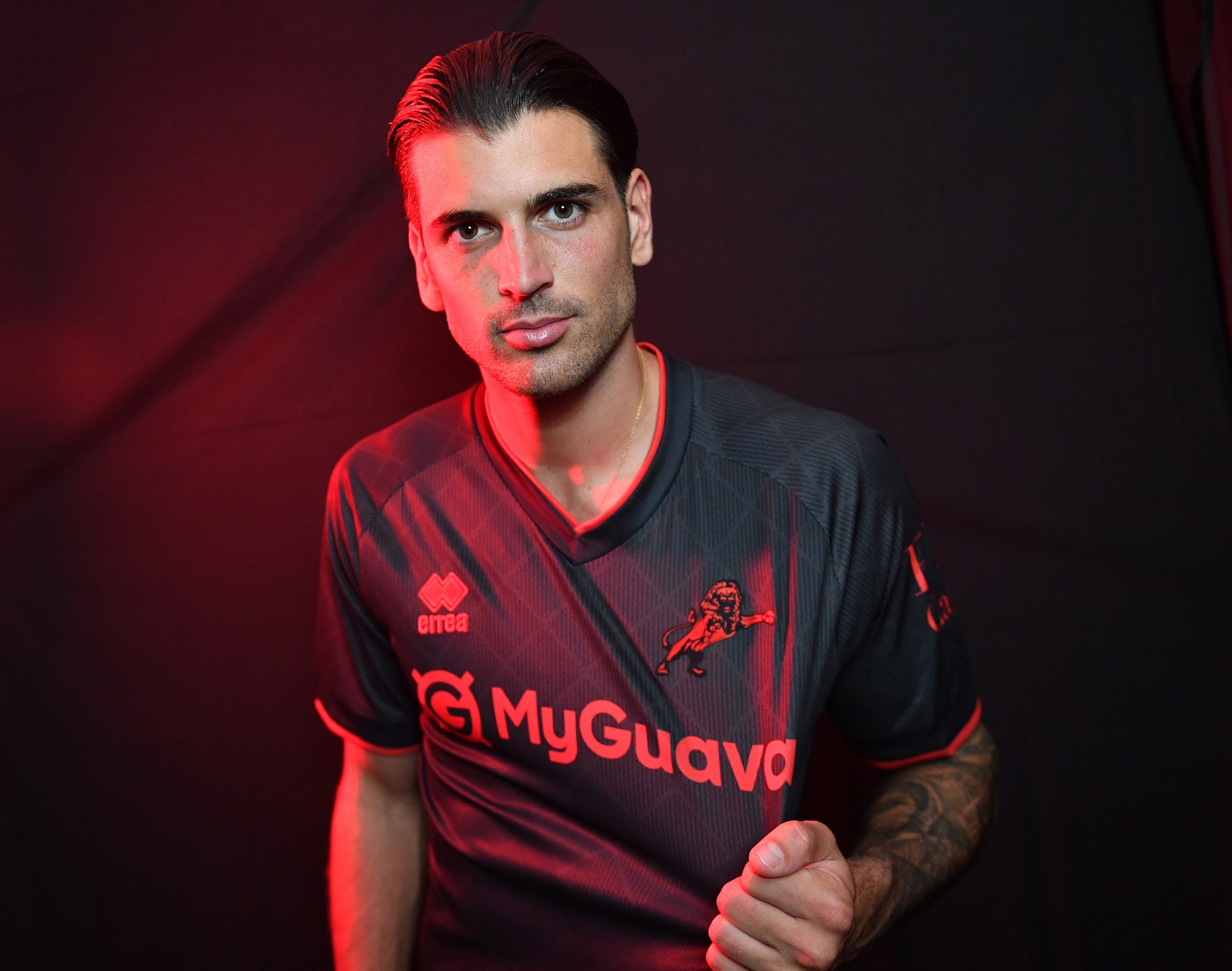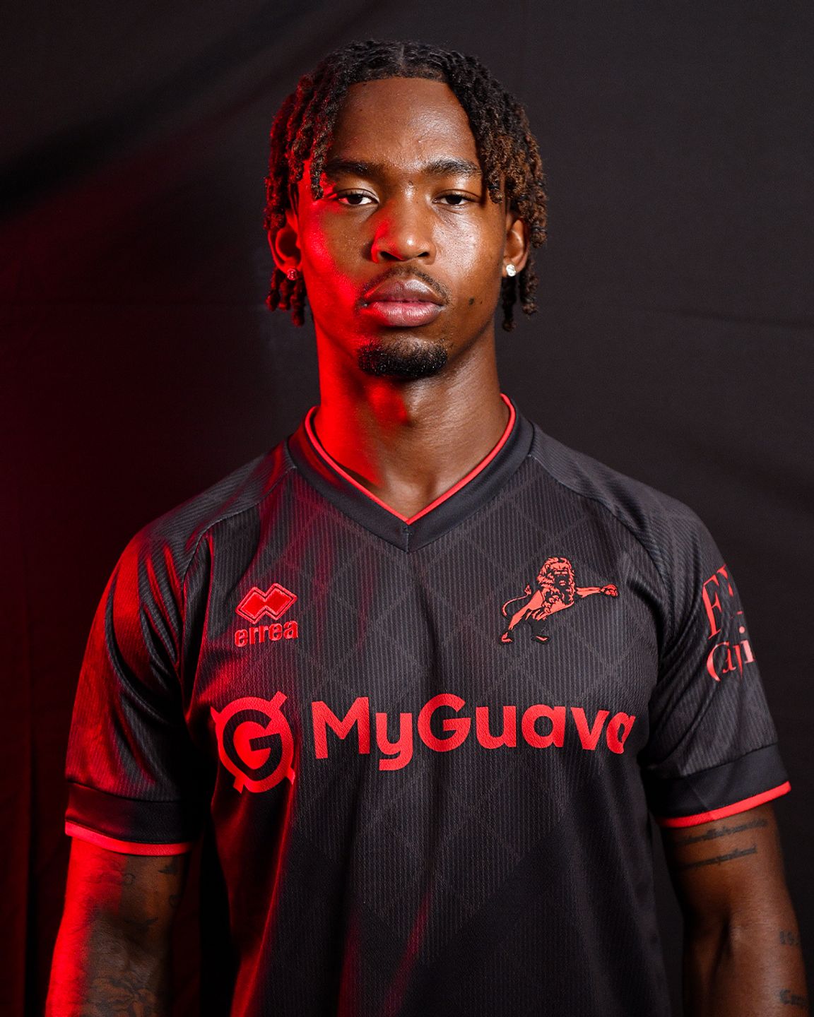 The all-black strip features a red ‘Leaping Lion’ crest on the left chest, with the Erreà logo opposite and main sponsor MyGuava displayed across the front. FXD Capital appears on the sleeve.
