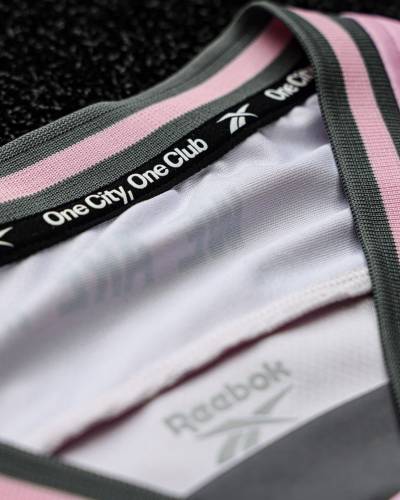 The new shirt features a pastel pink base with tonal pink vertical striping across the front, while monotone grey is used throughout the design, including on the Reebok logos, club crest, and underarm panels.
