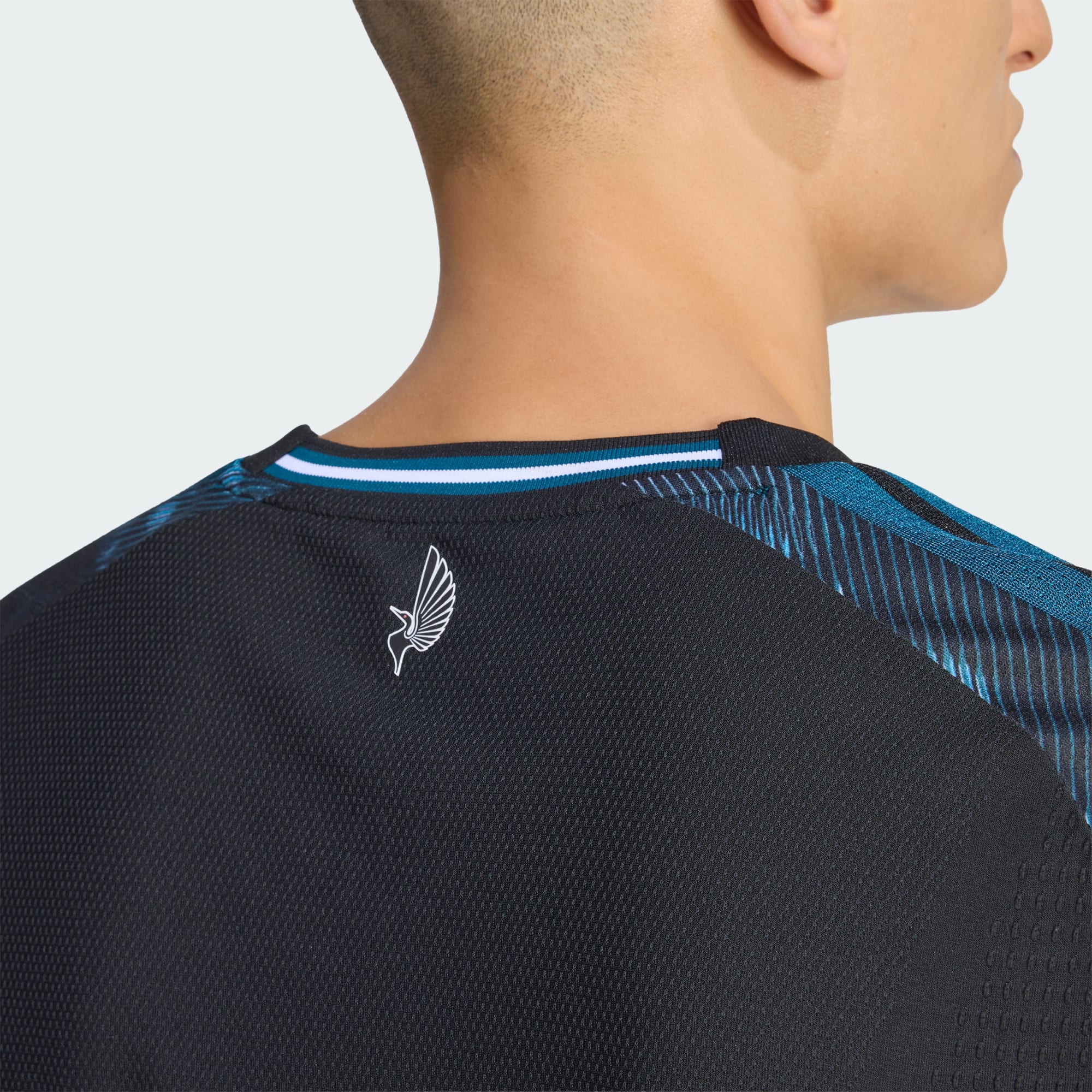 The new Minnesota United jersey combines established Loons identity elements with detailing drawn from previous MLS campaigns. A black base is intersected by a diagonal sash effect across the front, referencing the club’s inaugural design linked to the Mississippi River. The graphic is formed through rippling teal patterns inspired by the wing of the Common Loon, extending across the chest and sleeves, while the rear panel remains predominantly black with subtle performance texturing.