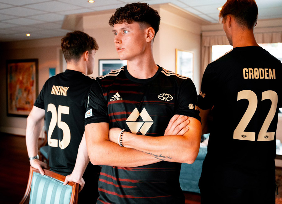 The adidas 2022-23 release for the Norwegian Eliteserien is in black with red, and this is overlaid with all partner logos and detailing in a golden tone.