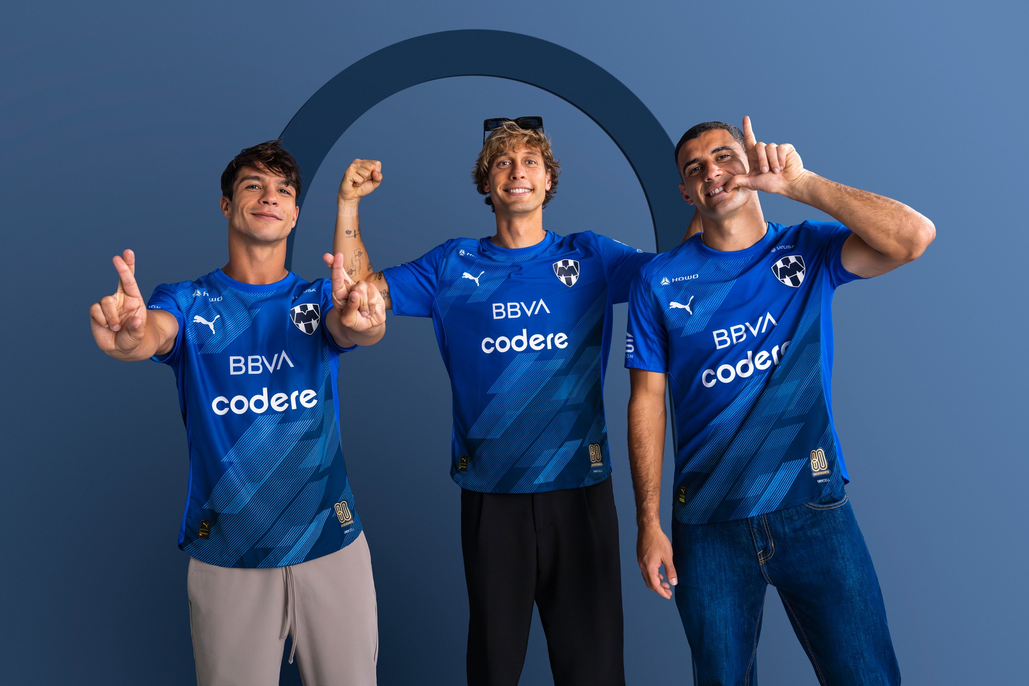 Positioned on the left chest is the Monterrey club crest in its standard black and white format, while the Puma cat sits opposite. BBVA takes the central sponsor position on the chest, with Codere placed just below. Partner branding also appears on both sleeves in white. Near the right hem, a gold commemorative emblem marks Monterrey’s 80 year anniversary.