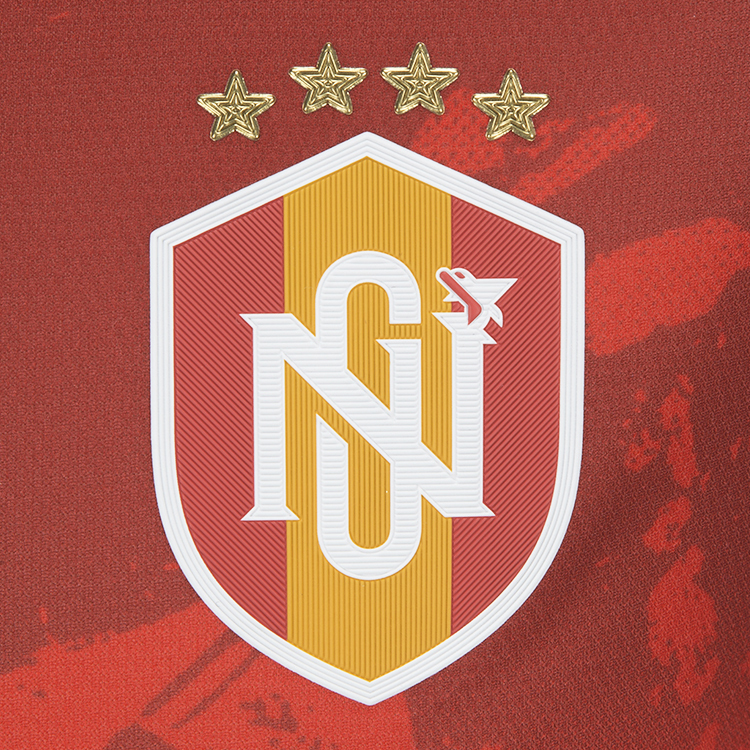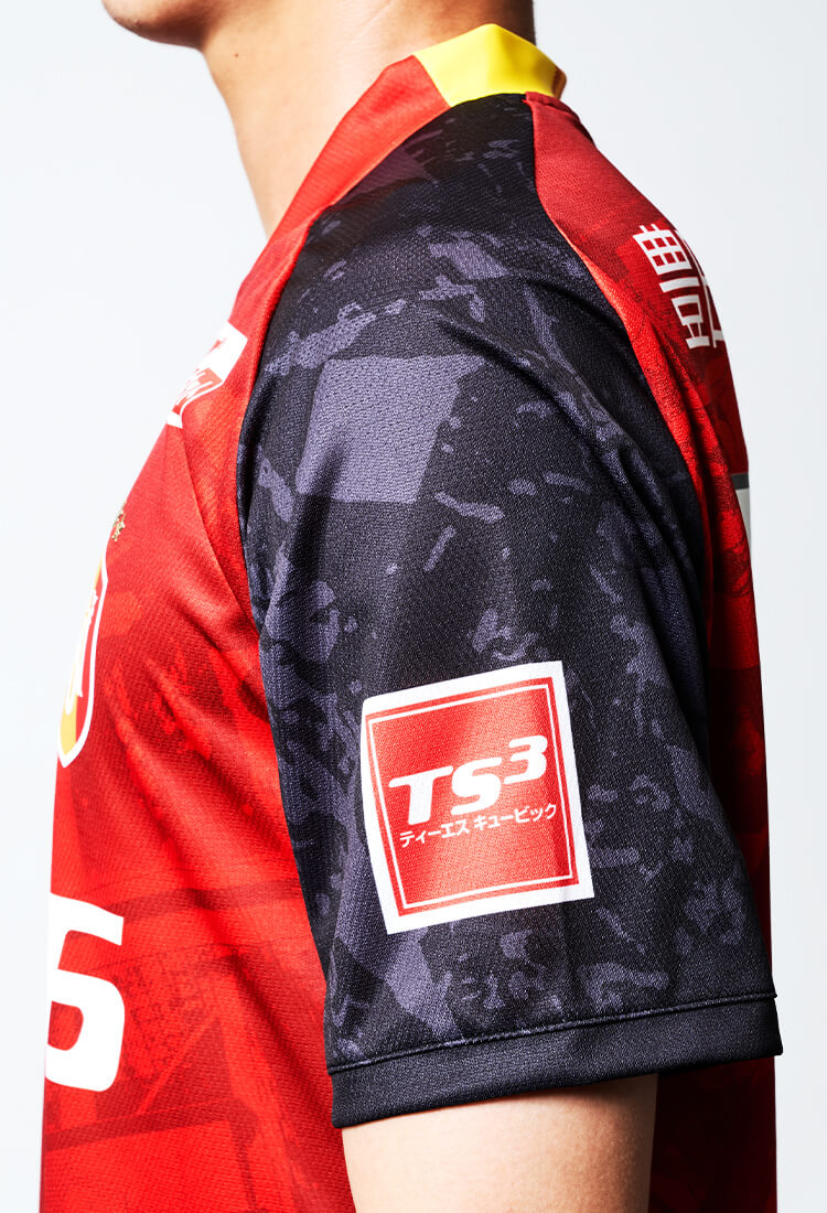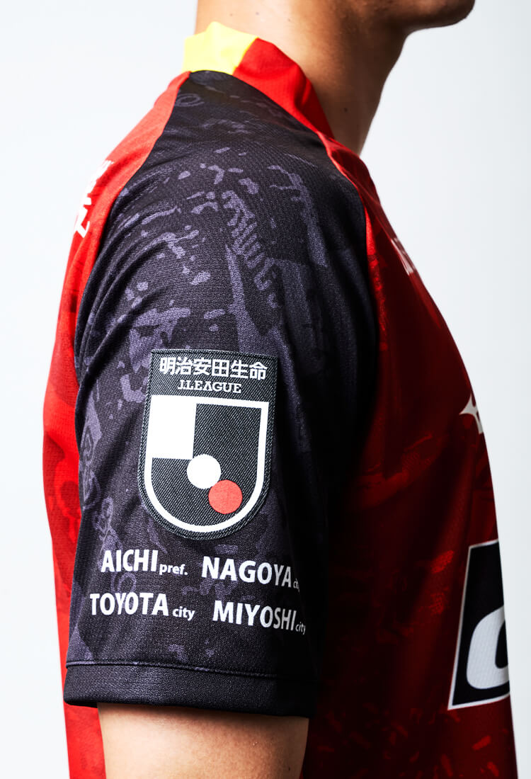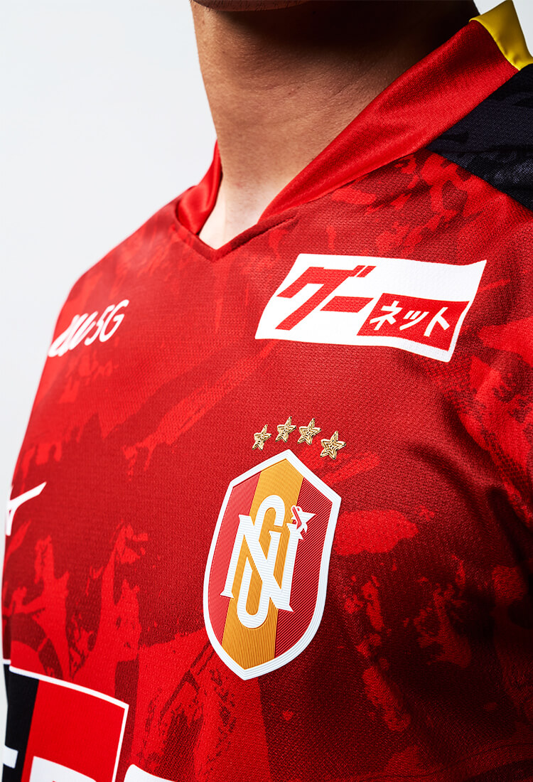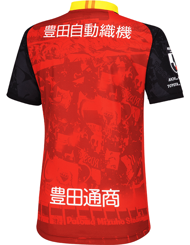 The sublimated collage pattern on the red trunk features images evoking both of Grampus’s home grounds - the Paloma Mizuho Stadium and the Toyota Stadium - and this embellishment continues onto the black raglan sleeves.