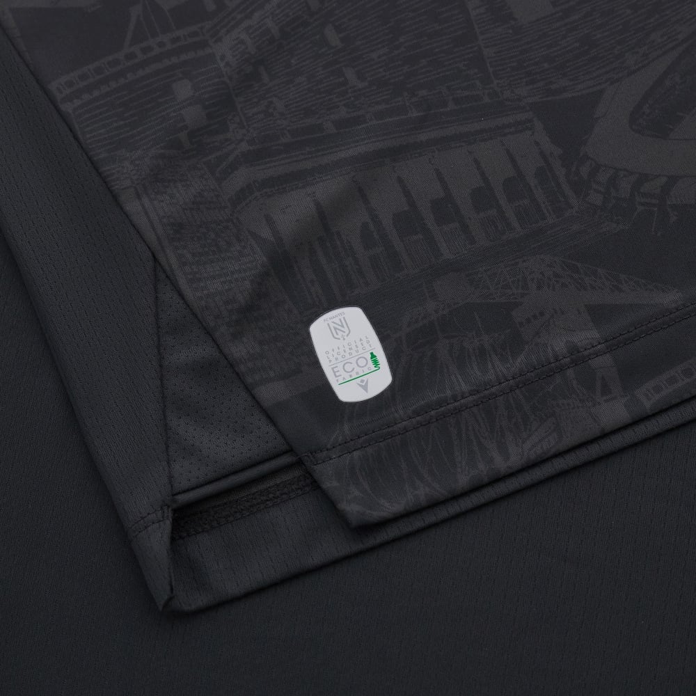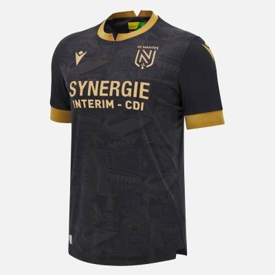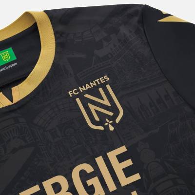 This black shirt with gold accents on the neck and sleeve cuffs features a dye-sub graphic of Nantes' iconic landmarks, including the Castle of the Dukes of Brittany, Passage Pommeraye, Lieu Unique, Bretagne Towers, Graslin Theatre, and the Beaujoire Stadium. The stadium, which is home to FC Nantes, is celebrating its 40th anniversary this year, having been inaugurated in May 1984 for the European Football Championship.