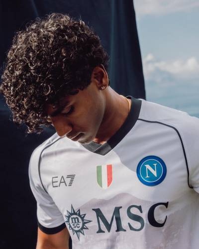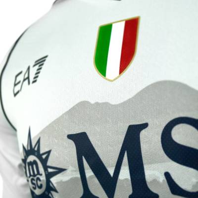 The new secondary release is ostensibly/largely white but carries a depiction of the famous nearby volcano, Mount Vesuvius, in grey, with partner logos - including that of Emporio Armani (EA7) - and aesthetic embellishment mainly in navy.
