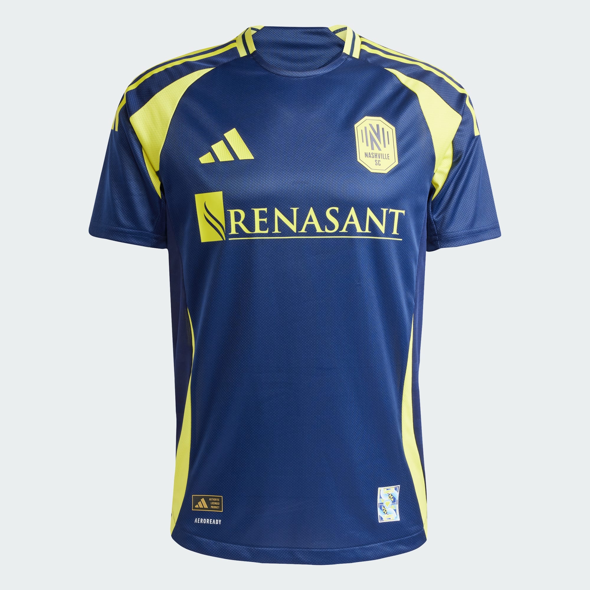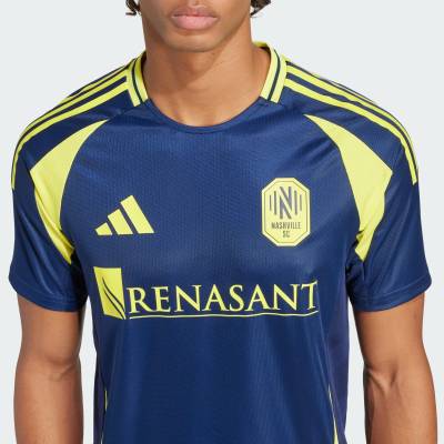 Inspired by the city's rich artistic heritage, the adidas kit goes beyond music, celebrating Nashville’s diverse creative community. The jersey features a Team Navy Blue base with Electric Gold accents on the shoulders and side panels. A unique soundwave-inspired detail on the back collar spells out "Nashville" in the shape of a heart, while the jock tag on the lower left incorporates a stylised football pitch with a heart at midfield—symbolising the deep connection between the club and its supporters.