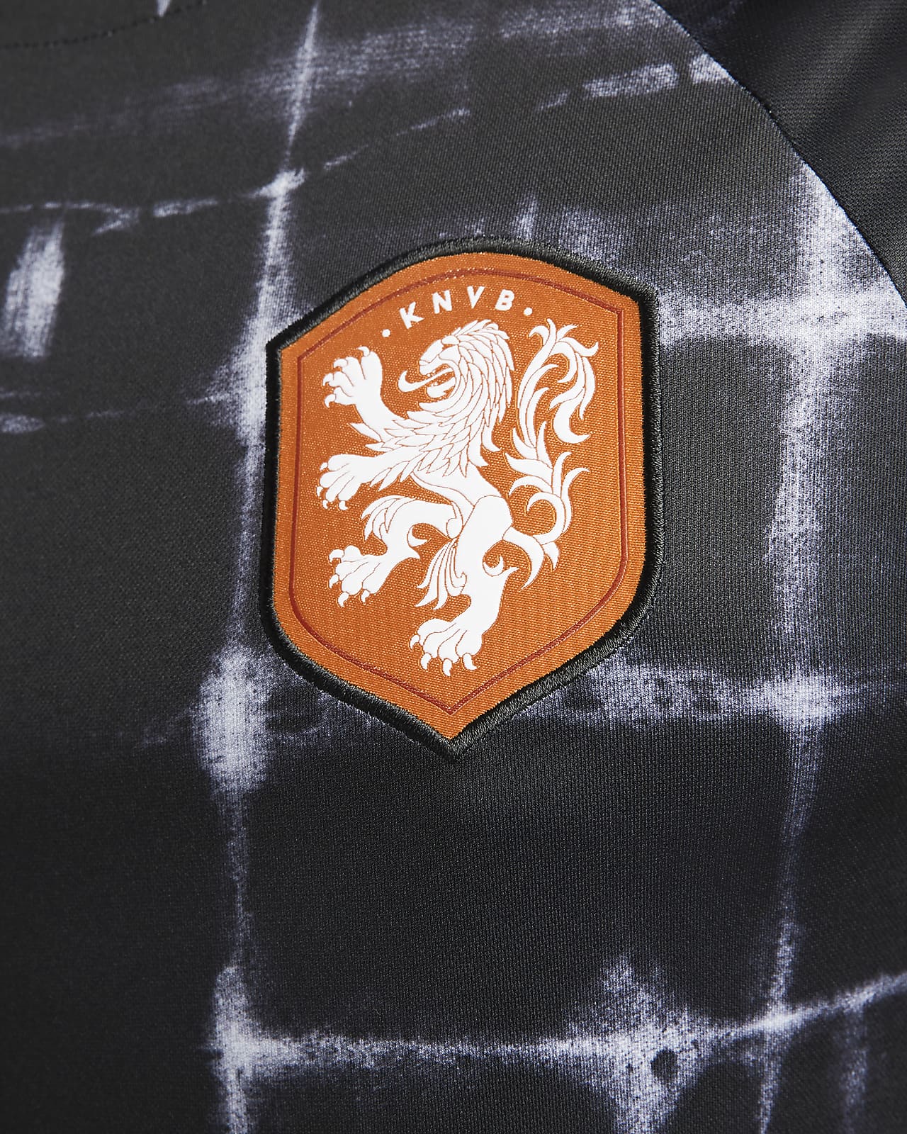 The 2022 warmup release for the Dutch shares the pseudo-tie-dye effect of the recent Home design, this time in black and white, while the crest is in white on orange with a black border to the shield.