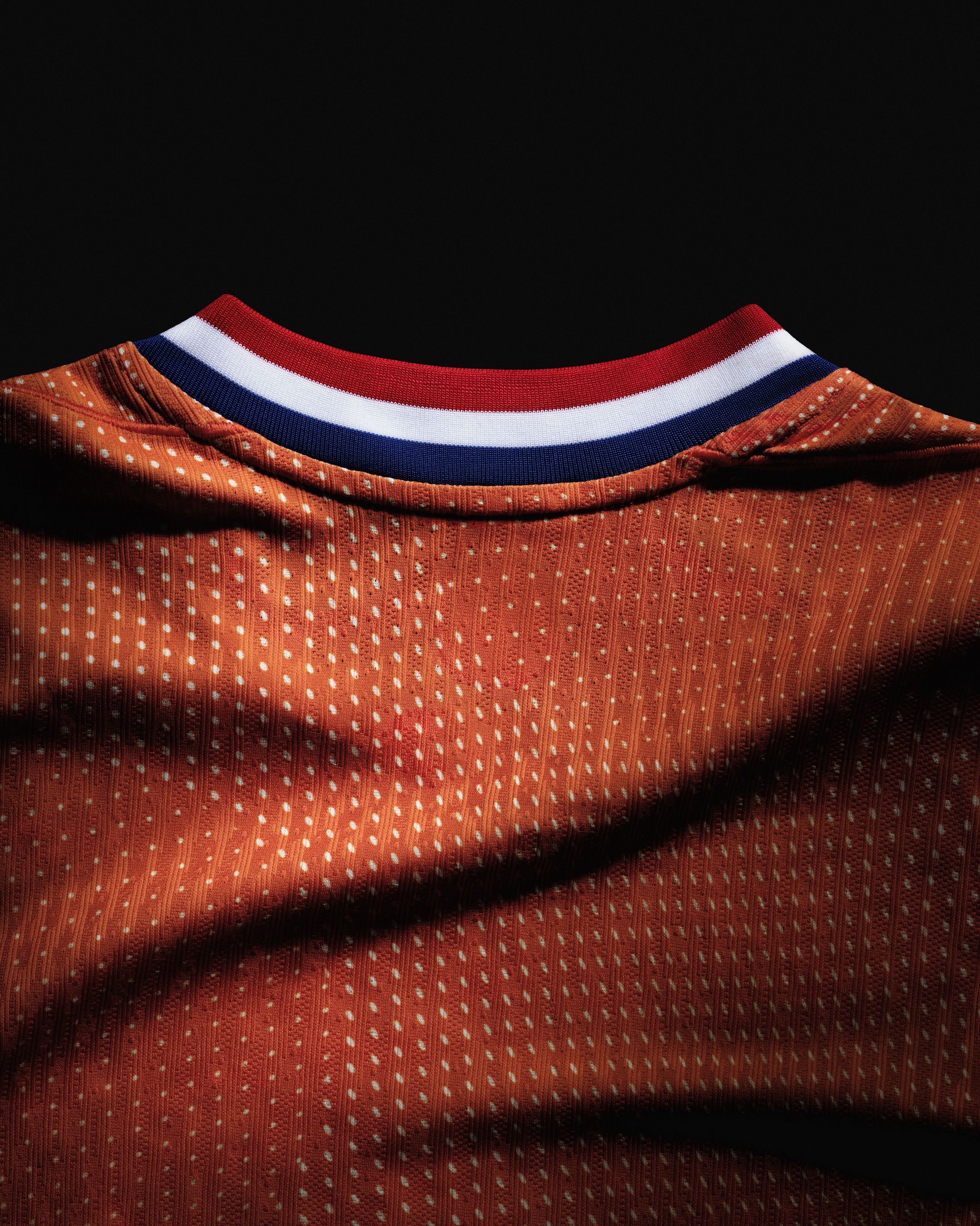 The names and numbers on the kit use a new font influenced by contemporary Dutch graphic design, including geometric forms and dot patterns.