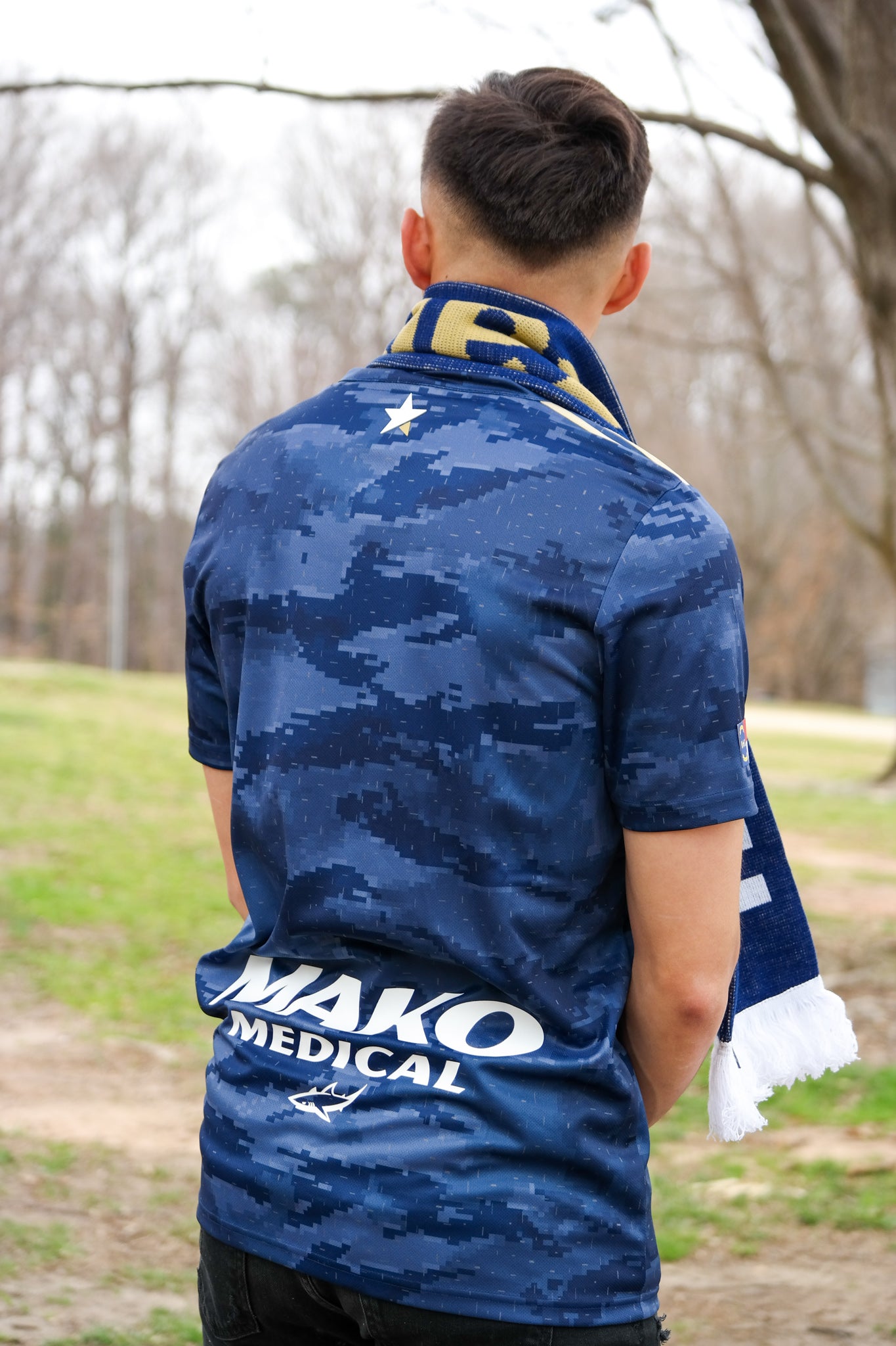 The new primary jersey features an overall navy blue digital pattern with gold accents, NC state flag on sleeve, and club star patch on the back of neck.